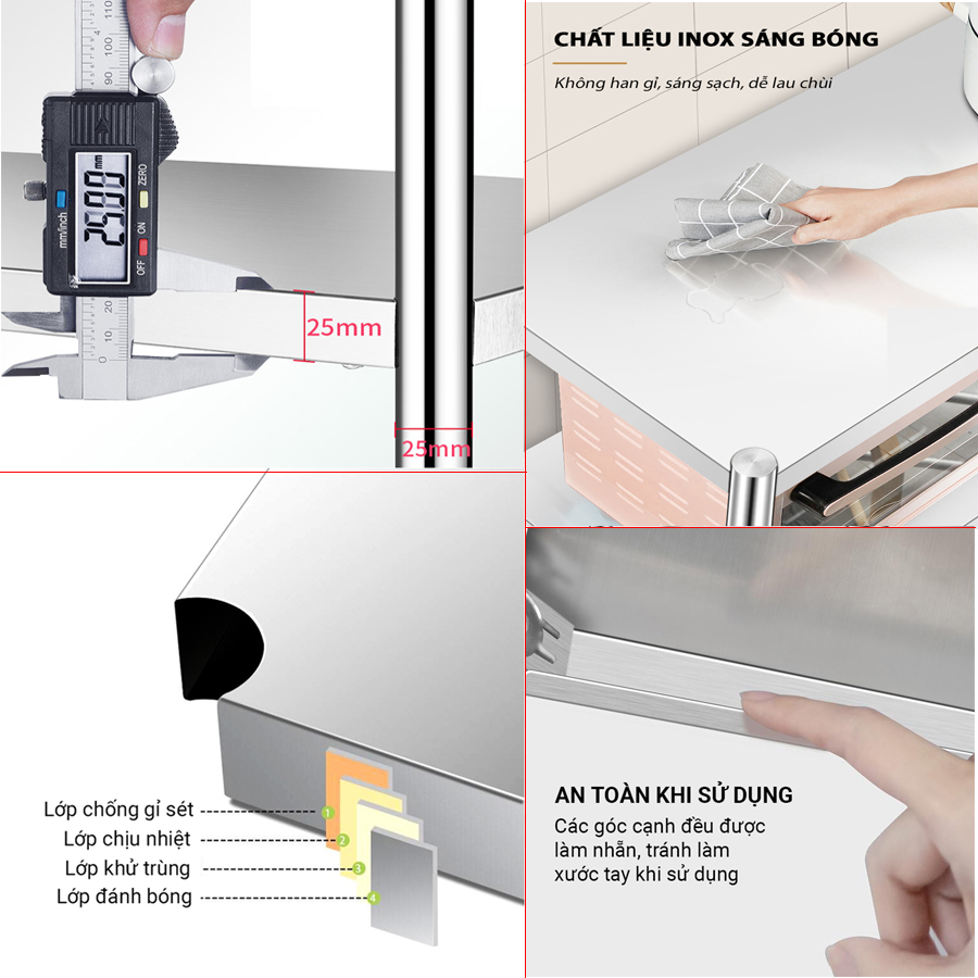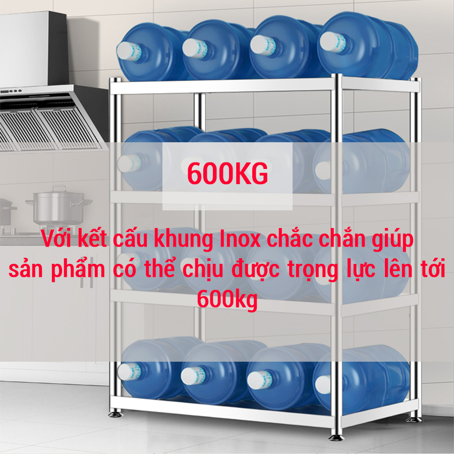 Với độ dày của Inox lên tới 2.5mm giúp bạn có thể đựng được rất nhiều các loại đồ dùng ở trên chiếc kệ mà không lo kệ bị sập hay hư tổn. Bạn có thể đựng ngay cả những chiếc lò vi sóng hạng nặng hay những chiếc nồi nướng khủng cũng đều được. Diện tích thiết kế giữa các tầng của kệ lắp ghép thông minh Kalpen cũng khá rộng rãi và lý tưởng cho việc lưu trữ đồ dùng nấu nướng hàng ngày của bạn.