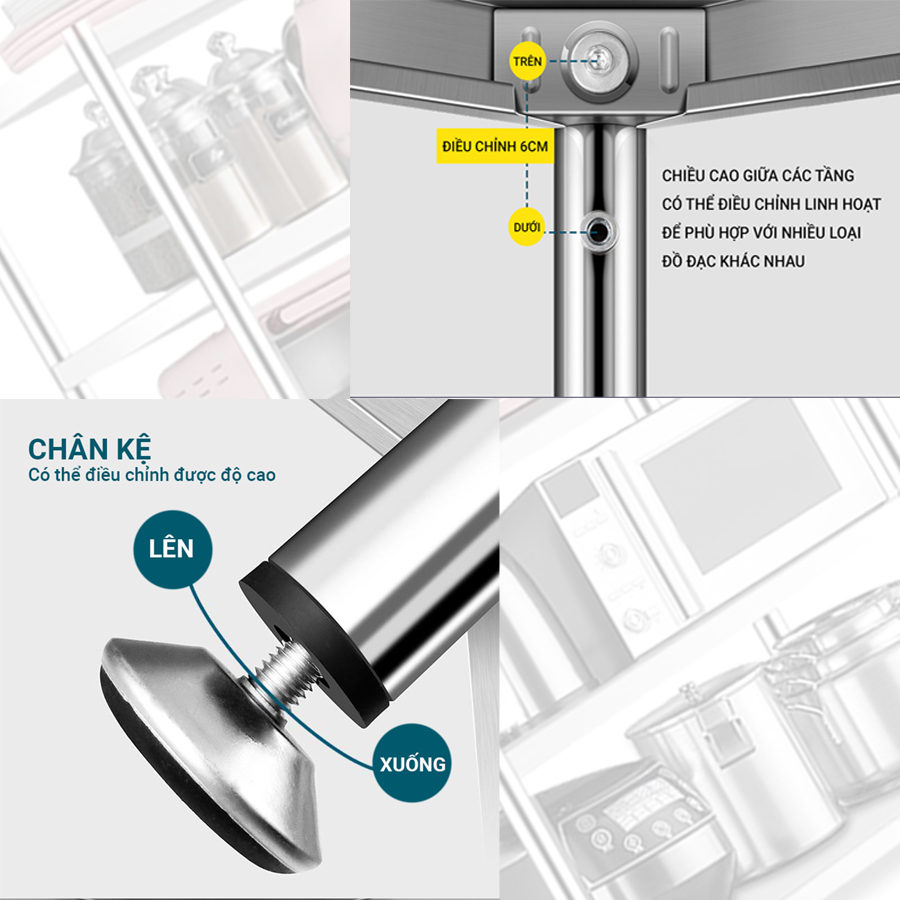 Phần chân kệ được thiết kế với dạng chân xoắn ốc xoay có thể điều chỉnh lên xuống phù hợp với nhu cầu của người sử dụng. Đặc biệt với hệ thống lỗ chờ giúp khách hàng hàng có thể tự do điều chỉnh kích thước lên xuống giữa các tầng với nhau.