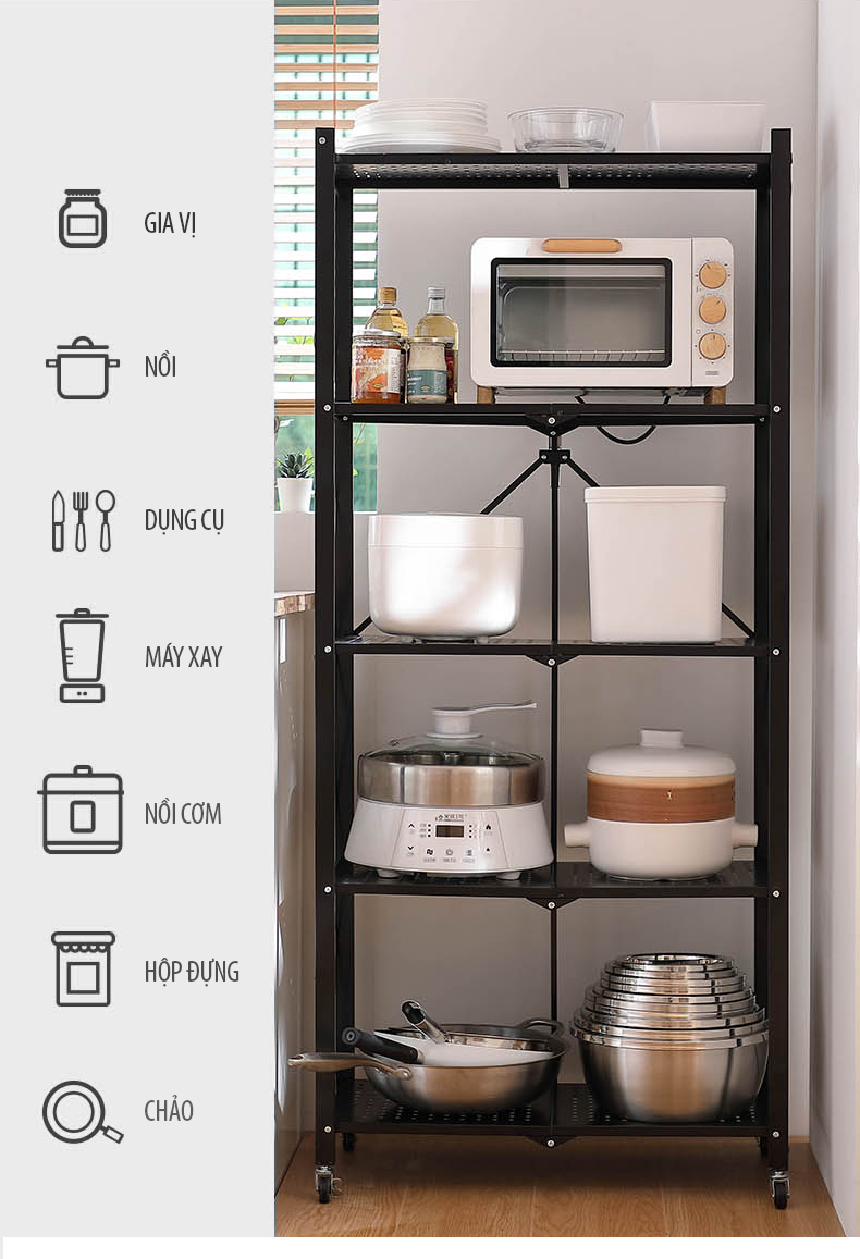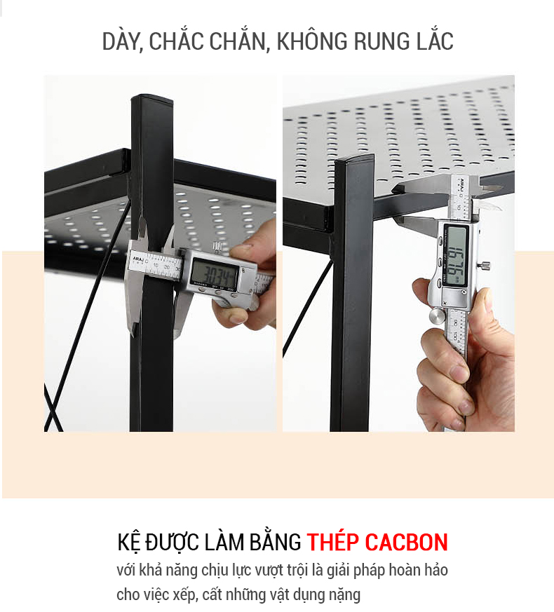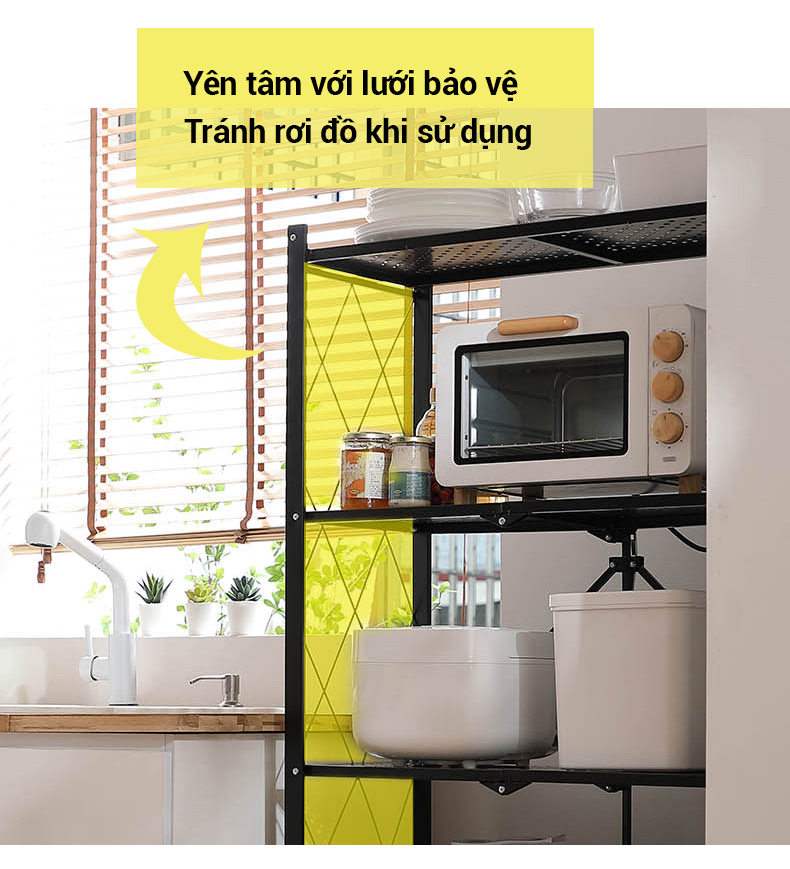 Bạn sẽ yên tâm đặt lò nướng, lò vi sóng, nồi cơm điện, bình nước 7kg 10kg, dụng cụ lao động, sách vở,…lên chiếc kệ đặc biệt này mà không sợ bị gãy hay sập. Tuy nhiên trong quá trình sử dụng, bạn cũng nên ước chừng lượng đồ vật muốn đặt lên kệ để tránh gây ra những hao tổn không đáng có.