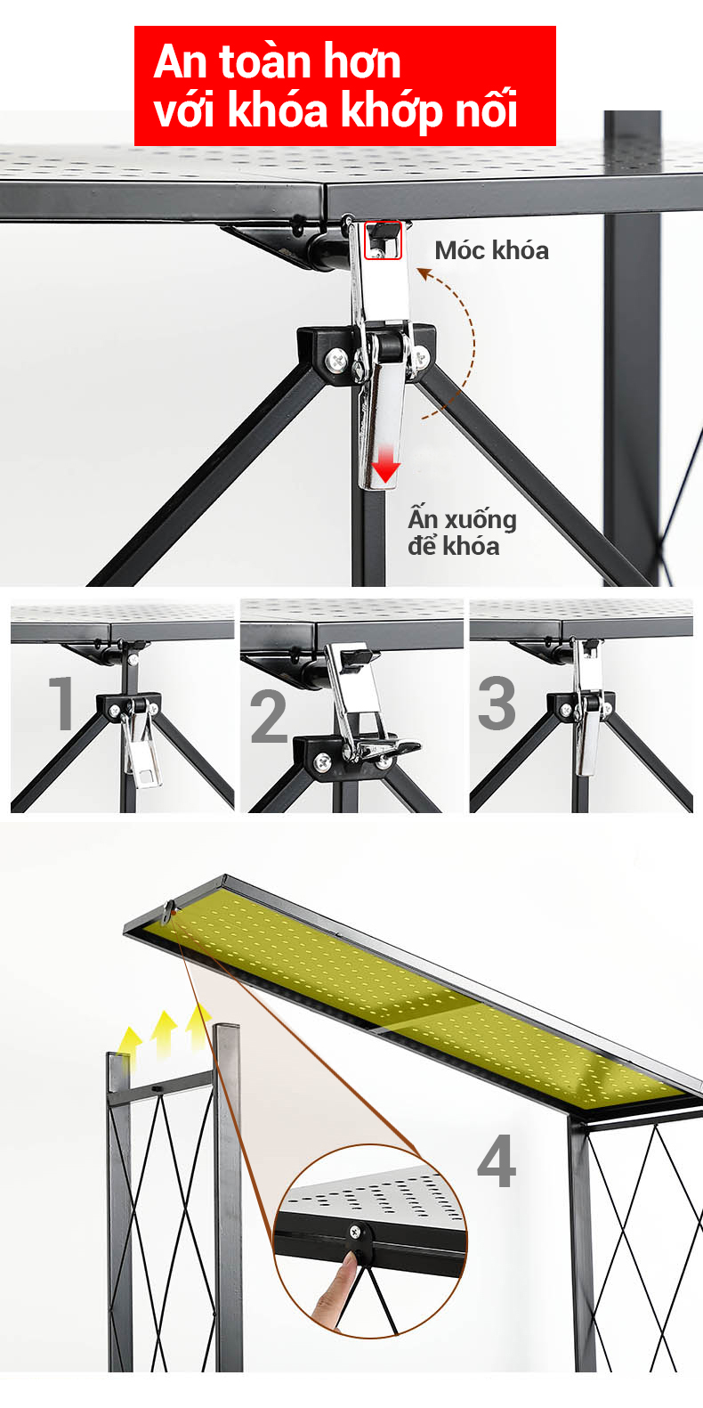 Điểm nổi bật của mẫu kệ gấp được thể hiện ở phần bệ inox mạ đen ngăn các tầng. Đặc biệt với thiết kế lỗ thông gió giúp các đồ vật không bị ứ đọng, bám bẩn như khi sử dụng các mẫu kệ thông thường khác.