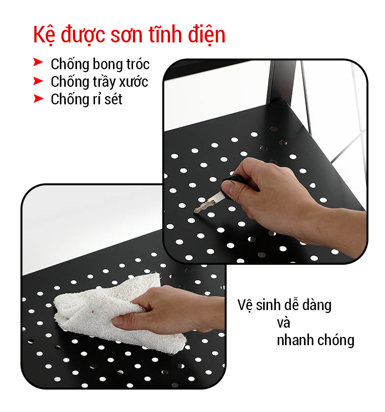 Được phủ 1 lớp sơn mạ khử khuẩn giúp kệ có khả năng tránh được sự xâm nhập của vi khuẩn hay nấm mốc. Do đó bạn có thể hoàn toàn yên tâm khi đặt các thực phẩm khô lên kệ mà không lo ảnh hưởng đến chất lượng.