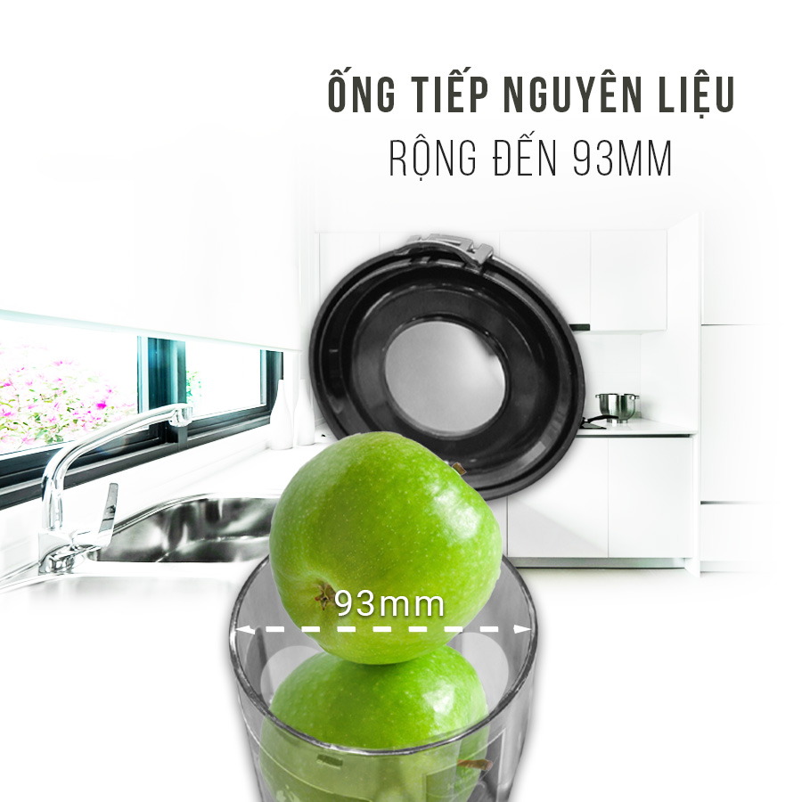 Một trong những điểm nổi bật của máy ép Kalpen J7 là thiết kế ống tiếp nguyên liệu rộng 93mm. Bạn có thể ép nguyên quả táo, lê hoặc cam mà không cần cắt nhỏ, giúp tiết kiệm thời gian và giảm công đoạn chuẩn bị nguyên liệu. Đây là một tính năng đặc biệt phù hợp với những người bận rộn nhưng vẫn muốn duy trì thói quen uống nước ép tươi hàng ngày.