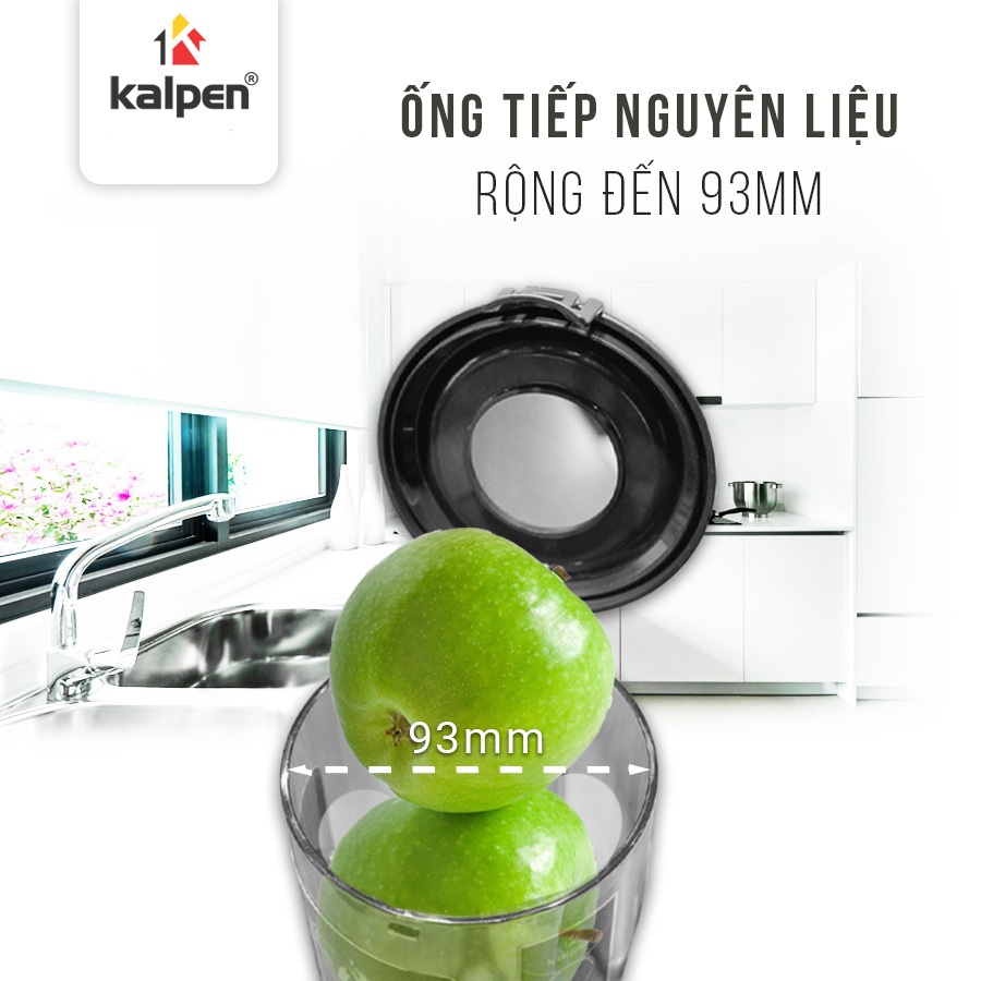 Máy ép chậm Kalpen J7 được trang bị ống tiếp nguyên liệu lớn đường kính 93 mm, cho phép ép trái cây nguyên quả mà không cần cắt nhỏ, giúp tiết kiệm thời gian và công sức, phù hợp với lối sống lành mạnh hằng ngày.
