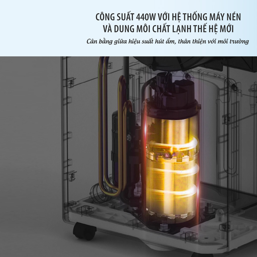 Cơ chế nén hiện đại giúp máy hoạt động ổn định, giảm rung, giảm tiếng gió và duy trì hiệu quả hút ẩm bền bỉ theo thời gian.