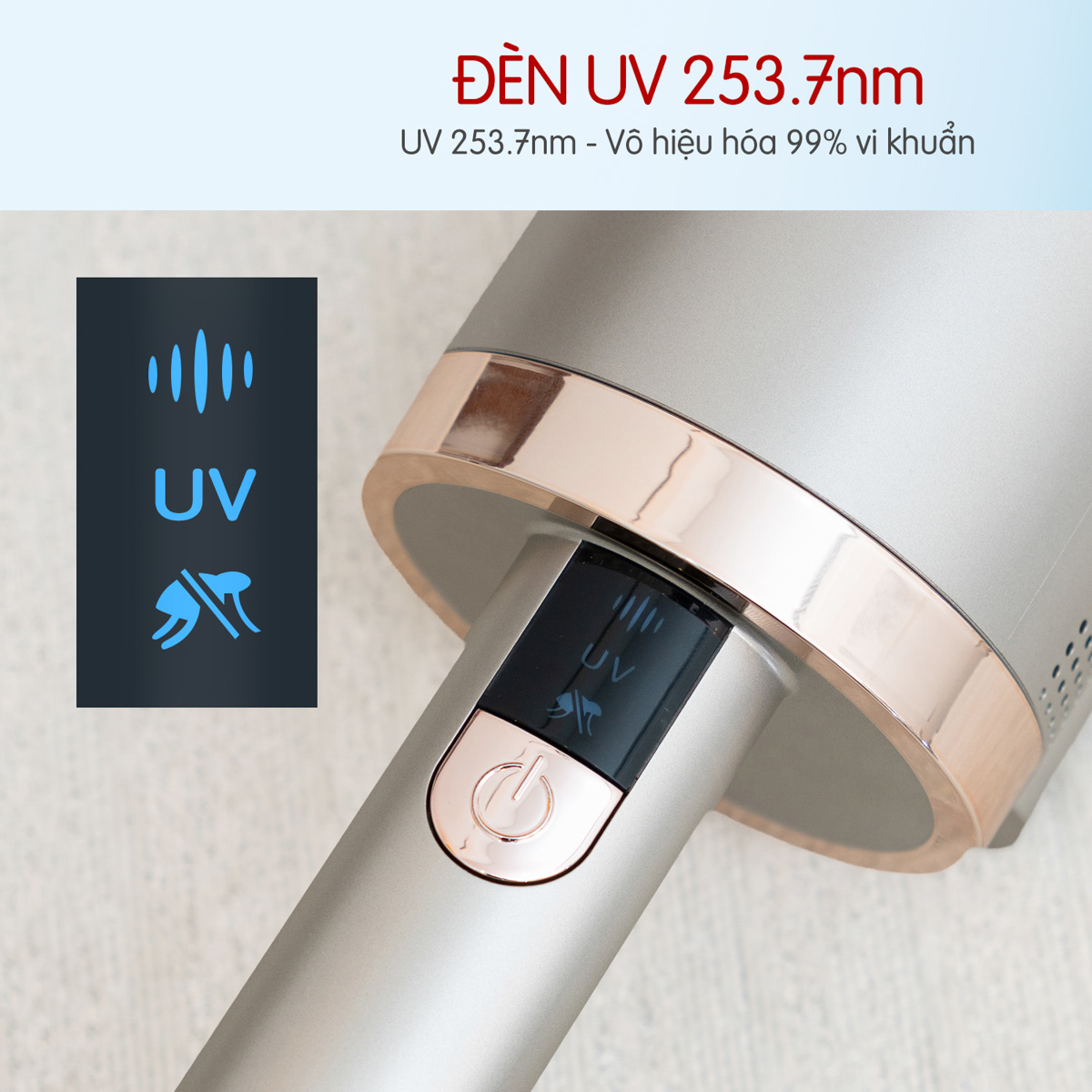vi khuẩn, nấm mốc và bọ ve, khiến chúng mất khả năng sinh sôi và tồn tại. Tia UV được phân bổ đều trên bề mặt giường nệm, gối, chăn và sofa, giúp diệt khuẩn hiệu quả mà không làm hư hại chất liệu, đặc biệt an toàn cho gia đình có trẻ nhỏ, người cao tuổi và người có cơ địa nhạy cảm.