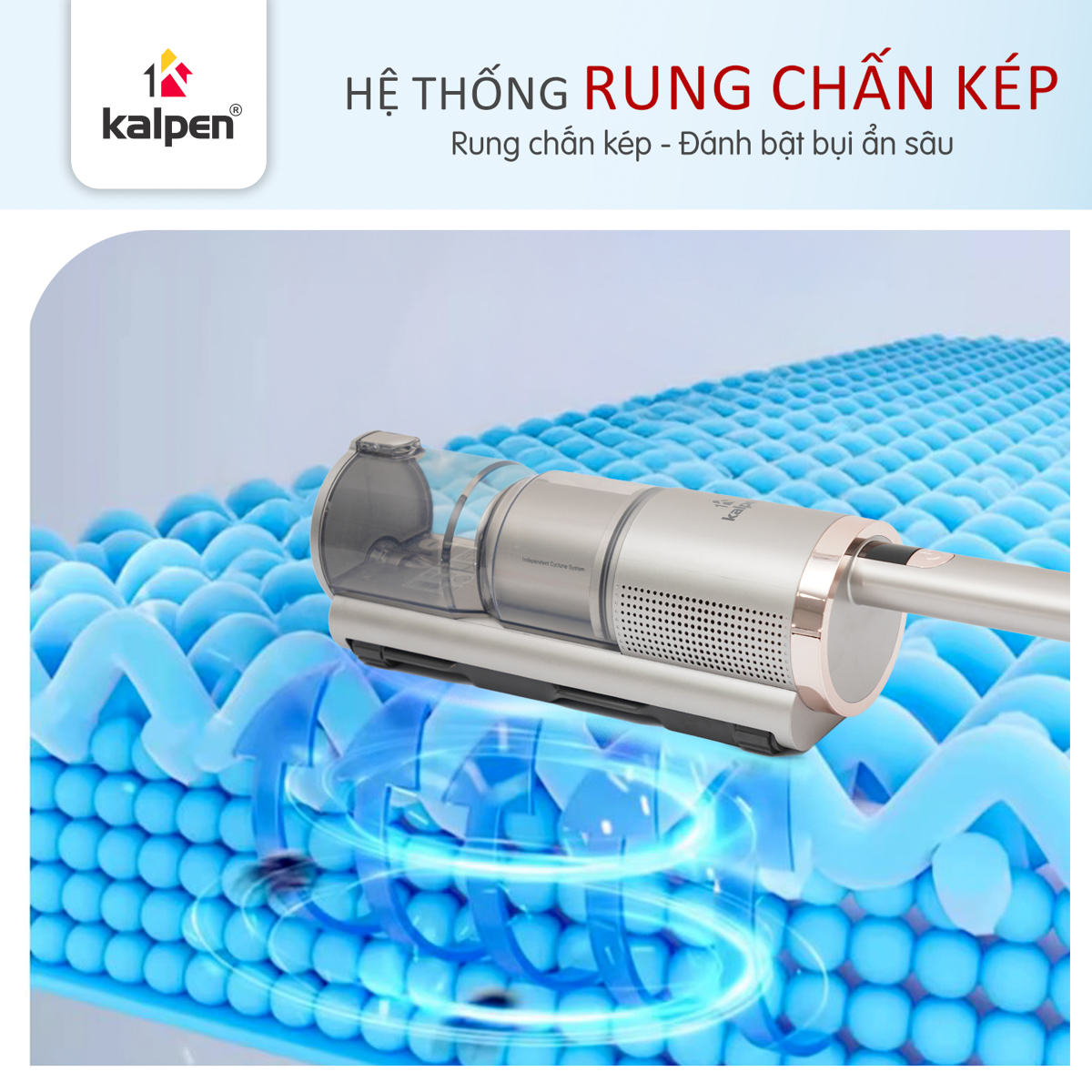 Máy hút bụi giường nệm Kalpen V4 sở hữu hệ thống 2 con lăn rung mạnh mẽ, tạo ra dao động cơ học tần số cao, giúp đánh bật bụi mịn, bọ ve