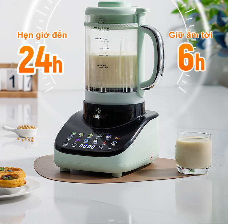 Với chức năng hẹn giờ nấu trước 24h máy làm sữa hạt chống ồn Kalpen H5 có thể giúp bạn chủ động hơn trong việc nấu sữa hạt. Sau khi hoàn thành quá trình nấu máy sẽ tự động chuyển sang chế độ giữ ấm trong 6 giờ, đảm bảo bạn luôn có những ly sữa hạt tươi ngon.