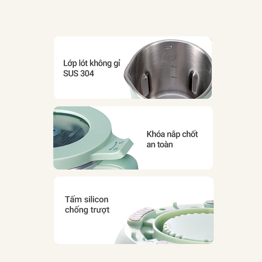 Bạn cũng không sợ bị nóng bỏng nếu lỡ va chạm với thân máy khi máy hoạt động vì máy có cấu tạo thân 3 lớp chống nóng hiệu quả: Lớp ngoài cùng là nhựa chống nóng, lớp giữa là lớp ngăn cách và tạo ra luồng khí giảm nhiệt, trong cùng là lớp inox 304 tuyệt đối an toàn khi tiếp xúc trực tiếp với thực phẩm.