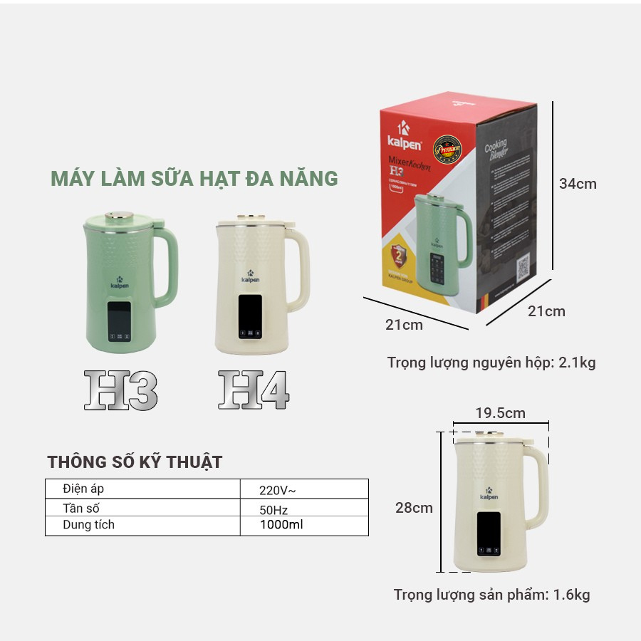 Máy làm sữa hạt mini Kalpen H3 1000ml được thiết kế nhỏ gọn, xinh xắn, màu sắc đẹp, hiện đại giúp tạo nên vẻ đẹp đồng bộ cho không gian bếp.