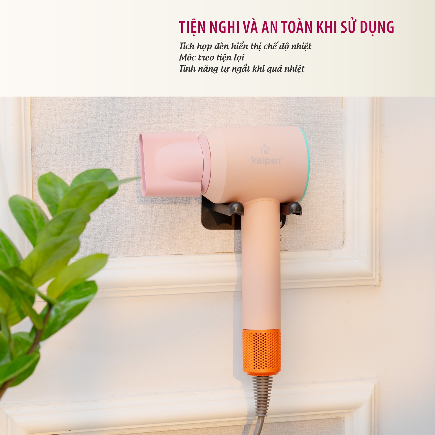 Với kiểu dáng nhỏ gọn, tay cầm chắc chắn, máy sấy tóc ion Kalpen mang đến cảm giác thoải mái khi cầm nắm và sử dụng lâu. Ngoài ra, máy còn có móc treo tiện lợi, dễ dàng cất giữ gọn gàng sau khi sử dụng, rất phù hợp với không gian phòng tắm hoặc salon có diện tích hạn chế.
