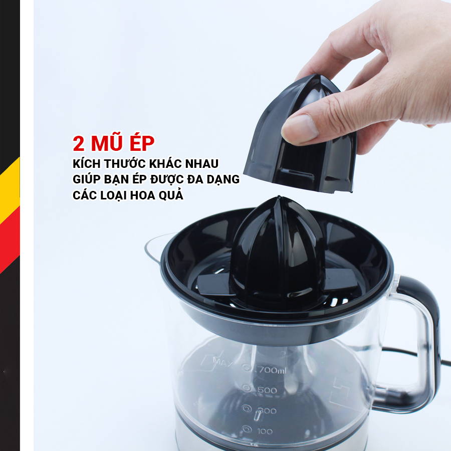 Hai mũ ép với kích thước khác nhau giúp bạn ép được đa dạng các loại hoa quả có múi. Do vậy, ngoài cam thì bạn cũng có thể ép được nhiều loại quả có múi khác nhau giúp đa dạng hơn trong quá trình sử dụng và biến các loại quả có múi khác thành nước ép nếu bạn muốn thay đổi cách thức ăn hoa quả bằng cách uống nước ép cũng là một cách hiệu quả để cung cấp các chất dinh dưỡng cho cơ thể.