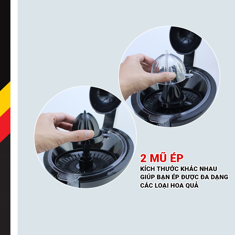 4. Hai mũ ép với kích thước khác nhau giúp bạn ép được đa dạng các loại hoa quả có múi. Không riêng gì cam mà bạn có thể ép được nhiều các loại quả đa dạng khác miễn là những loại quả đó có múi, đặc điểm này giúp bạn đa dạng hơn trong việc lựa chọn các loại hoa quả để góp phần bổ sung thêm nhiều vitamin và chất dinh dưỡng cho cả gia đình bạn.