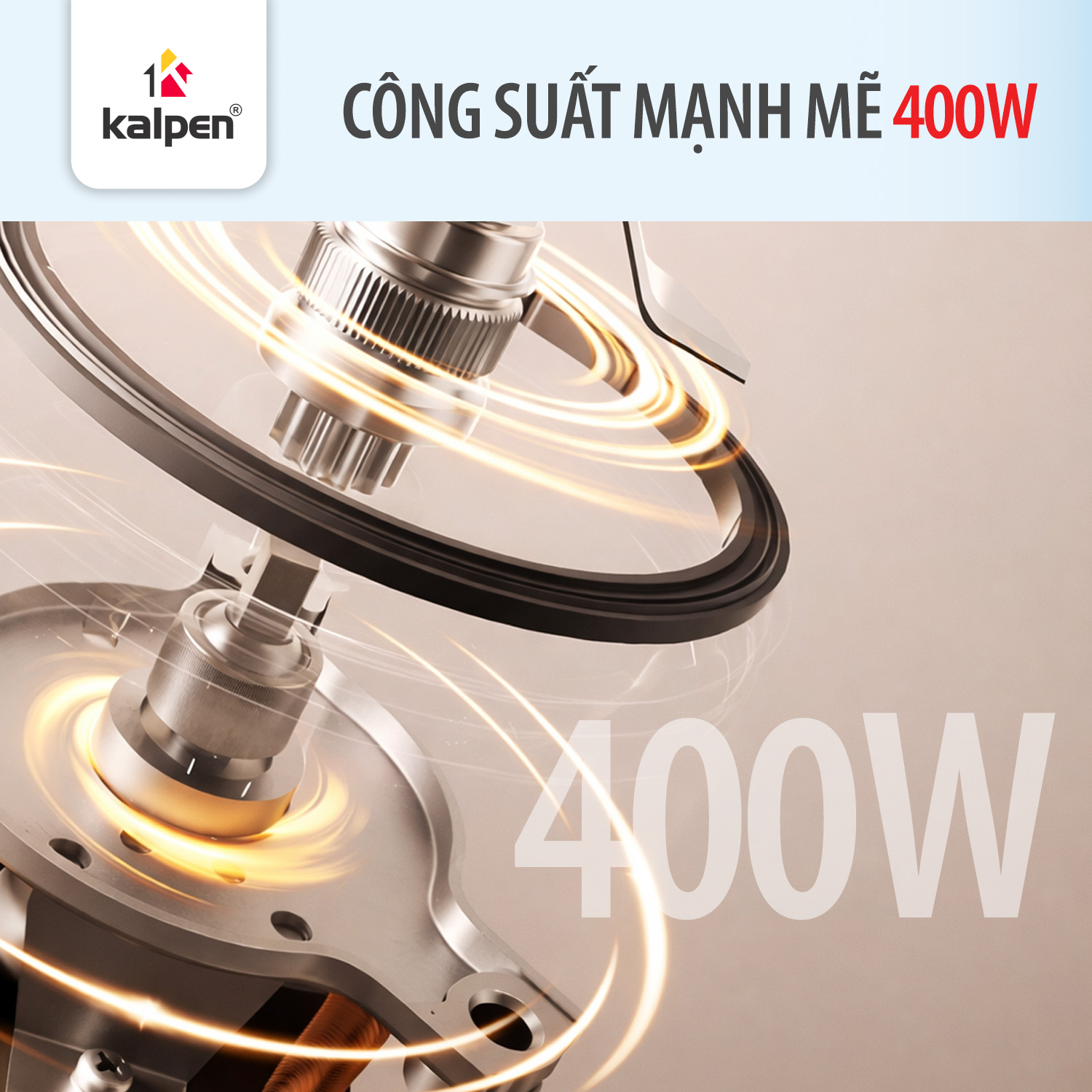 Kalpen B9 được trang bị động cơ bằng đồng nguyên chất công suất 400 W, hoạt động ổn định ở dải điện áp 220–240 V, tần số 50–60 Hz. Động cơ đồng không chỉ cho hiệu suất xay mạnh mẽ hơn so với các loại động cơ nhôm thông thường mà còn bền bỉ, ít sinh nhiệt, kéo dài tuổi thọ sản phẩm.