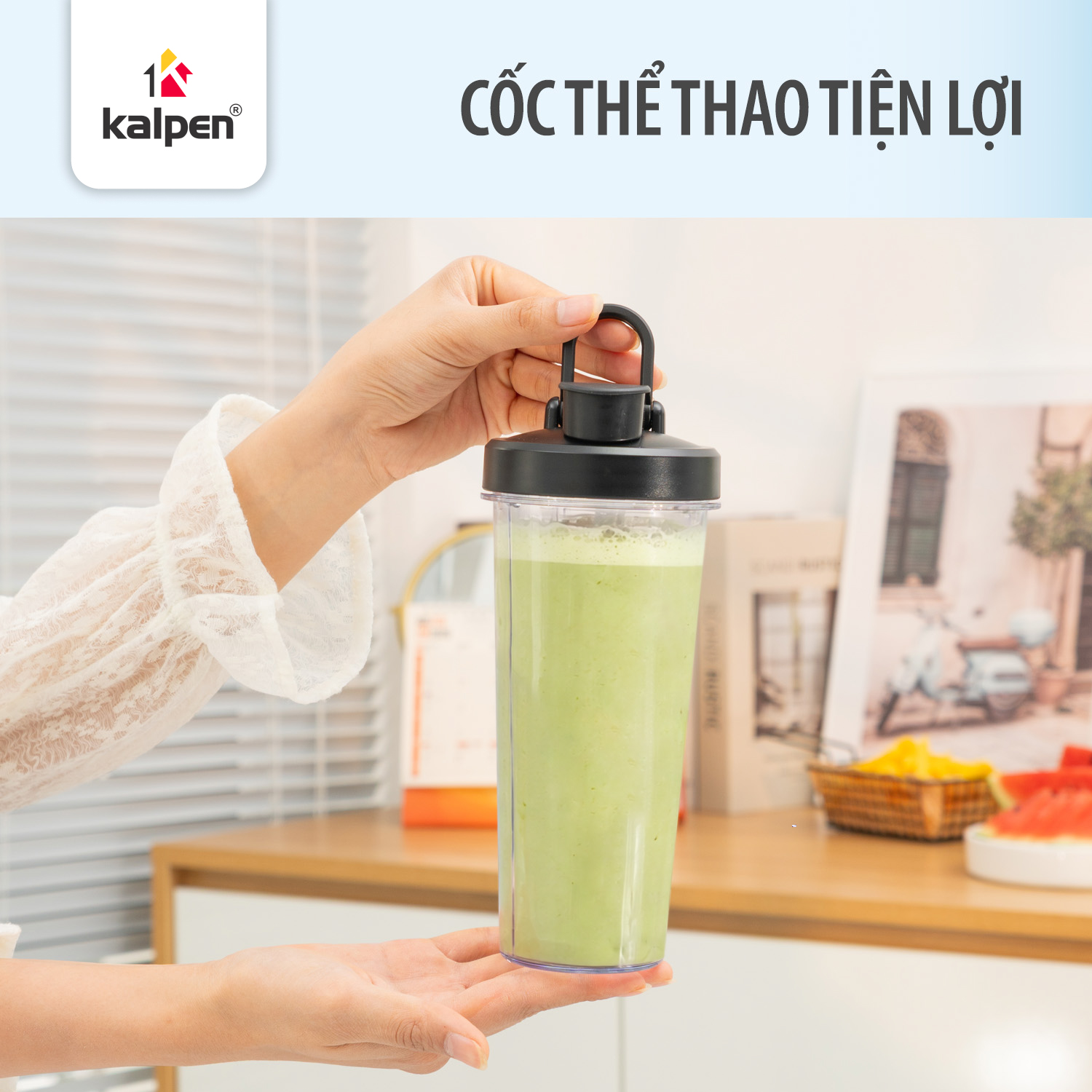 Máy xay sinh tố Kalpen B9 sở hữu kiểu dáng compact, màu sắc trẻ trung, hiện đại, dễ dàng di chuyển và mang theo trong các chuyến picnic hoặc du lịch.