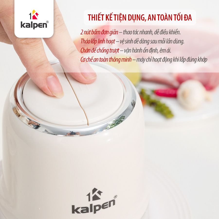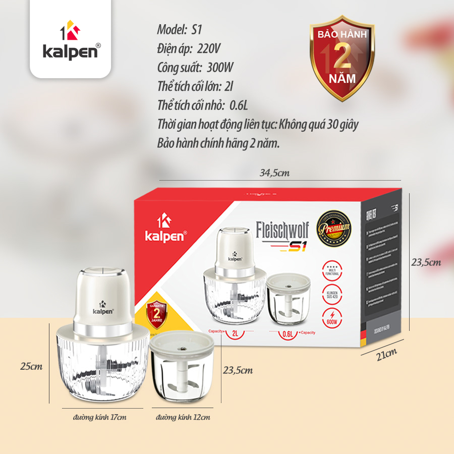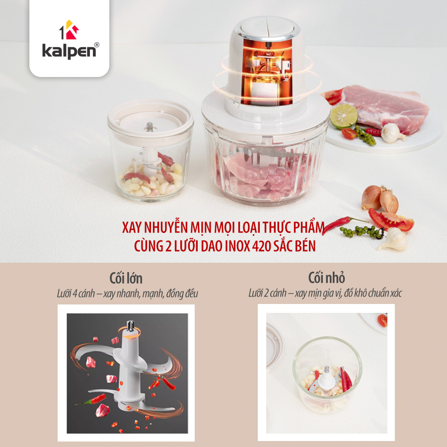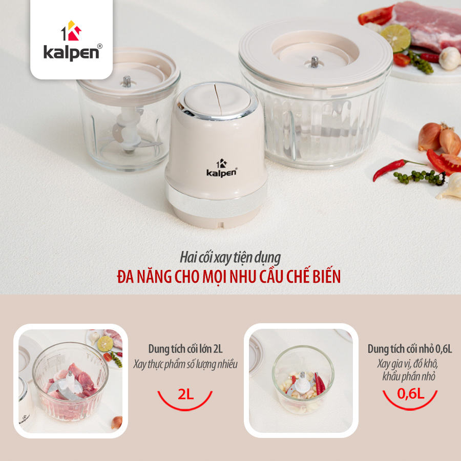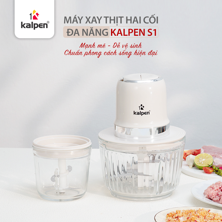Máy xay đa năng Kalpen S1 được trang bị 2 cối xay riêng biệt với 2 dung tích khác nhau. Cối lớn dung tích 2 L có thể sử dụng để xay thịt, cá, các loại thực phẩm lớn trọng lượng khoảng 500 g. Cối nhỏ dung tích 600 ml phù hợp để xay các loại đồ khô hoặc gia vị như xay tiêu, hành tỏi, các loại hạt…