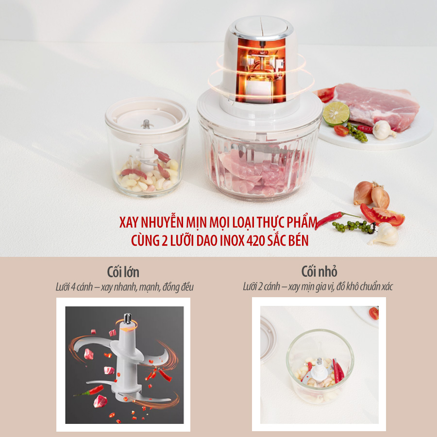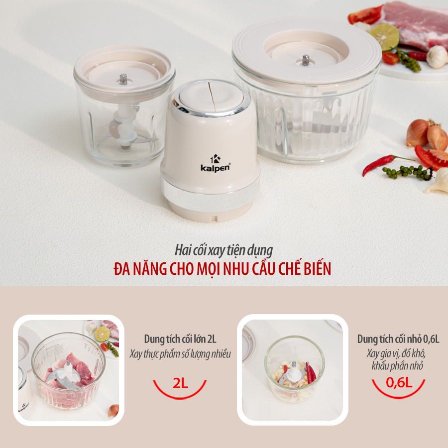 Máy xay đa năng Kalpen S1 được trang bị 2 cối xay riêng biệt với 2 dung tích khác nhau. Cối lớn dung tích 2L có thể sử dụng để xay thịt, cá, các loại thực phẩm lớn trọng lượng khoảng 500gr. Cối nhỏ dung tích 600ml phù hợp để xay các loại đồ khô hoặc gia vị như xay tiêu, hành tỏi, các loại hạt…