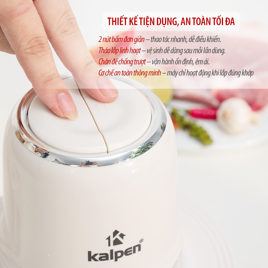 Kalpen Việt Nam giới thiệu máy xay thịt hai cối đa năng Kalpen S1, dung tích 2L. Kalpen mong muốn với những sản phẩm tiện ích này bữa cơm gia đình người Việt sẽ trở nên ấm cúng, nhẹ nhàng hơn với người nội trợ.