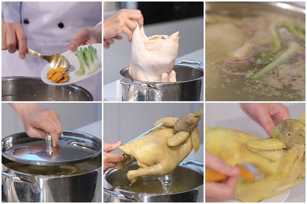 Sau đó nhúng gà vào nồi nước sôi 2-3 lần theo thao tác nhúng xuống nhấc lên để gà quen với nhiệt độ. Sau đó xếp gà vào nồi luộc, lưu ý đặt phần đùi xuống dưới. Đậy vung kín, đun sôi trở lại rồi hạ lửa xuống mức thấp nhất để liu riu trên bếp khoảng 15-20 phút thì tắt bếp. Ủ thêm 5-7 phút rồi vớt gà ra ngâm vào nước đá lạnh cho da giòn. Chờ gà nguội vớt ra để ráo nước.