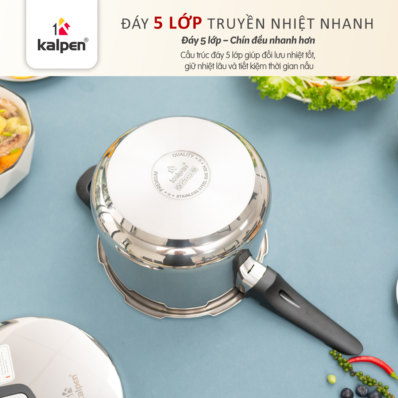 Nồi sử dụng được trên bếp từ, bếp ga và bếp hồng ngoại. Sản phẩm được thiết kế và nghiên cứu bởi Kalpen Group, đi kèm chế độ bảo hành chính hãng lên tới 5 năm, mang lại sự yên tâm lâu dài cho người dùng.