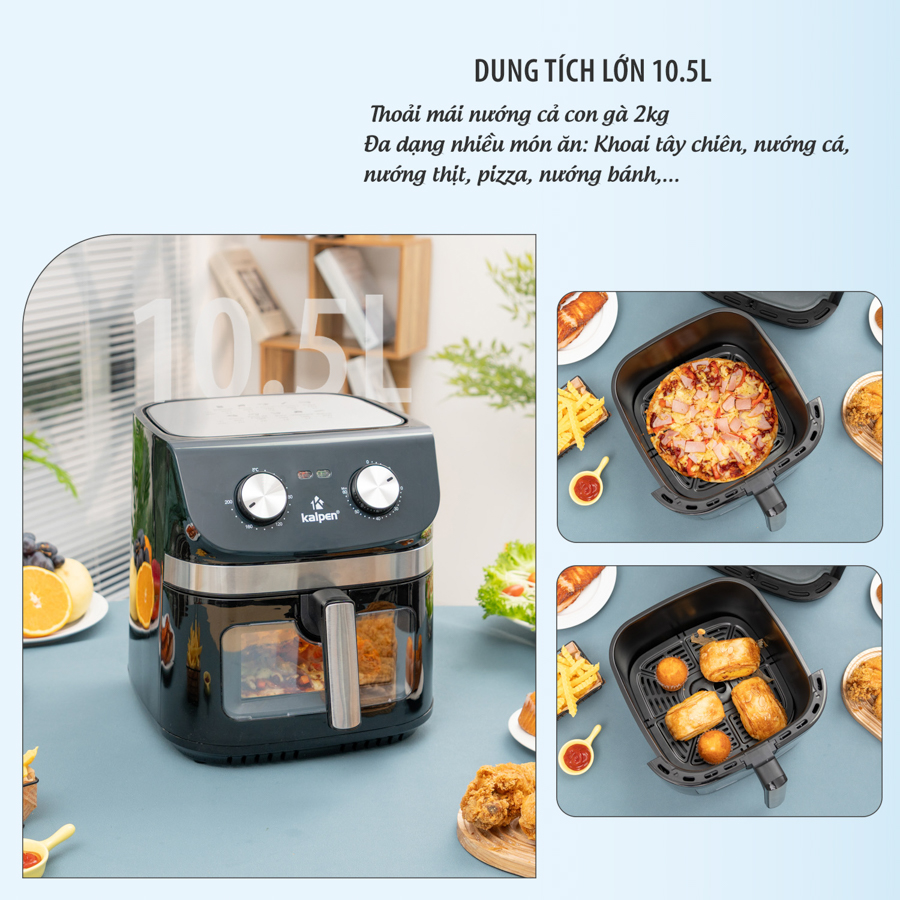 Dung tích cực lớn 10.5L cho phép bạn nướng nguyên con gà 2kg hoặc chế biến đồng thời nhiều món ăn như khoai tây, cánh gà, sườn nướng, bánh mì, cá hồi...