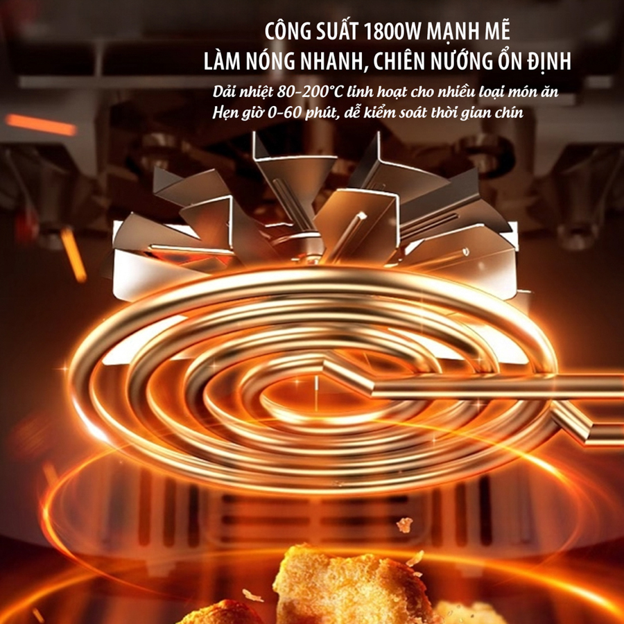 Nồi chiên không dầu công suất 1800W Kalpen F1 giúp làm nóng cực nhanh chỉ trong vài phút, tiết kiệm thời gian nấu nướng. Thực phẩm chín đều từ trong ra ngoài, giòn ngoài – mềm trong, giữ nguyên độ mọng nước và hương vị tự nhiên.