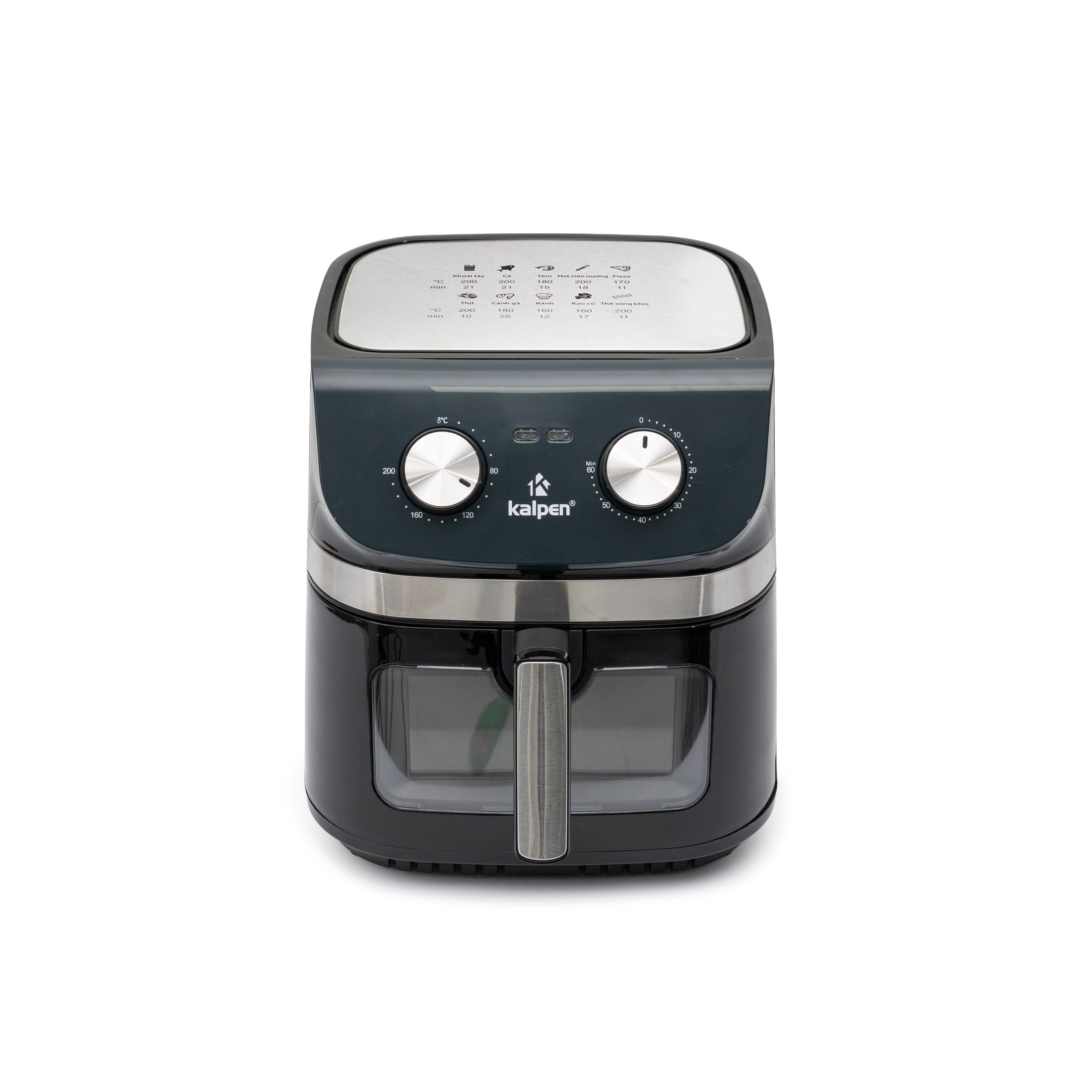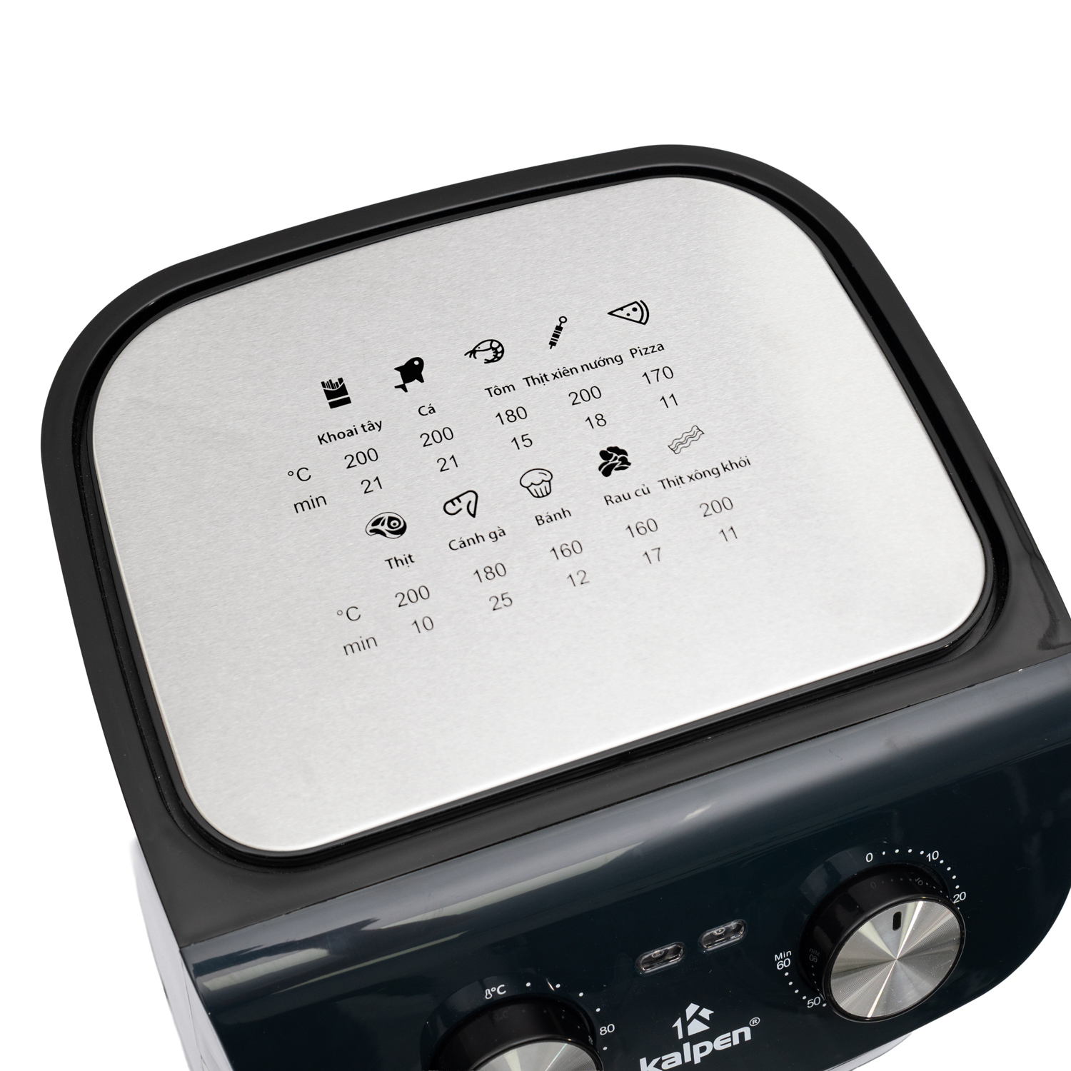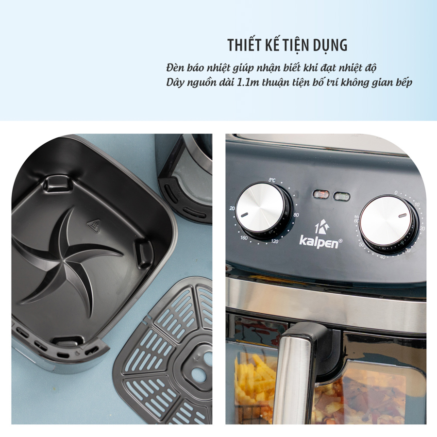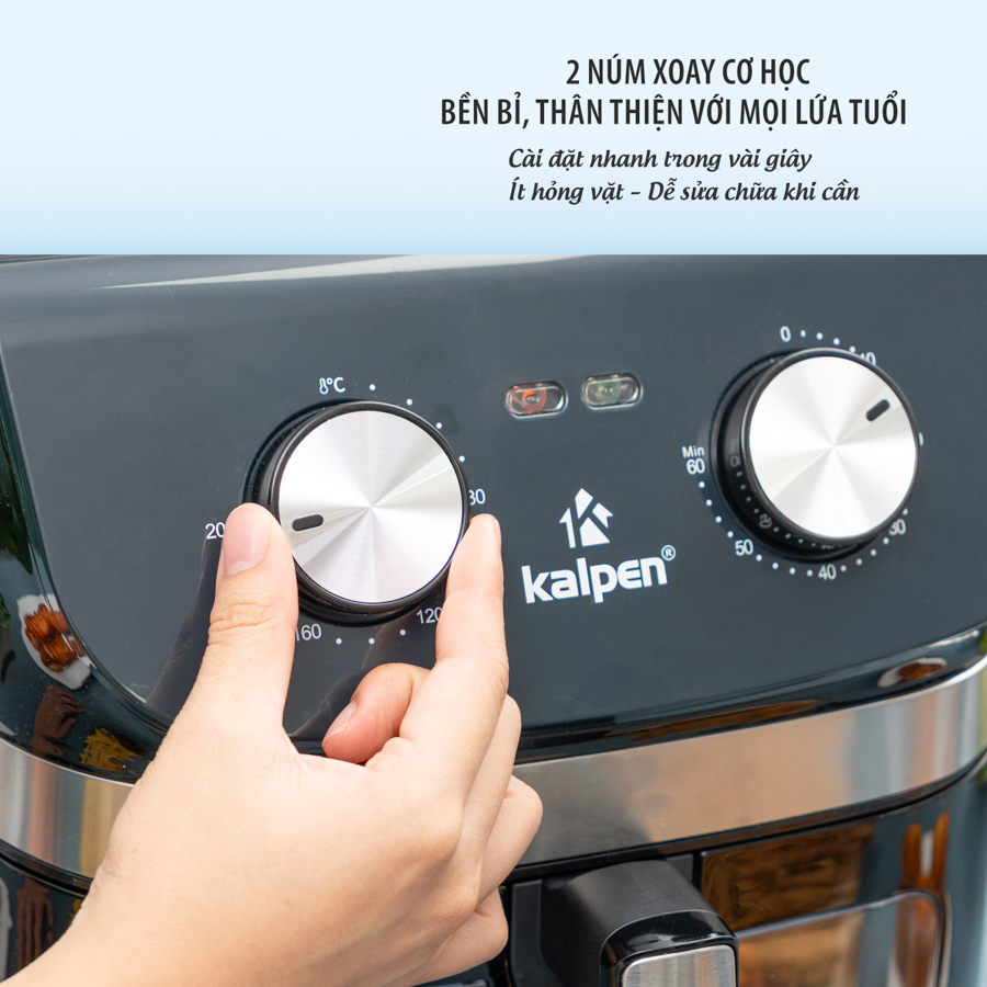 Kalpen F1 cho phép người dùng tùy chỉnh nhiệt độ linh hoạt từ 80°C đến 200°C và hẹn giờ tối đa 60 phút, phù hợp với từng loại thực phẩm khác nhau: từ chiên, nướng, quay, sấy khô, hâm nóng cho đến làm bánh.