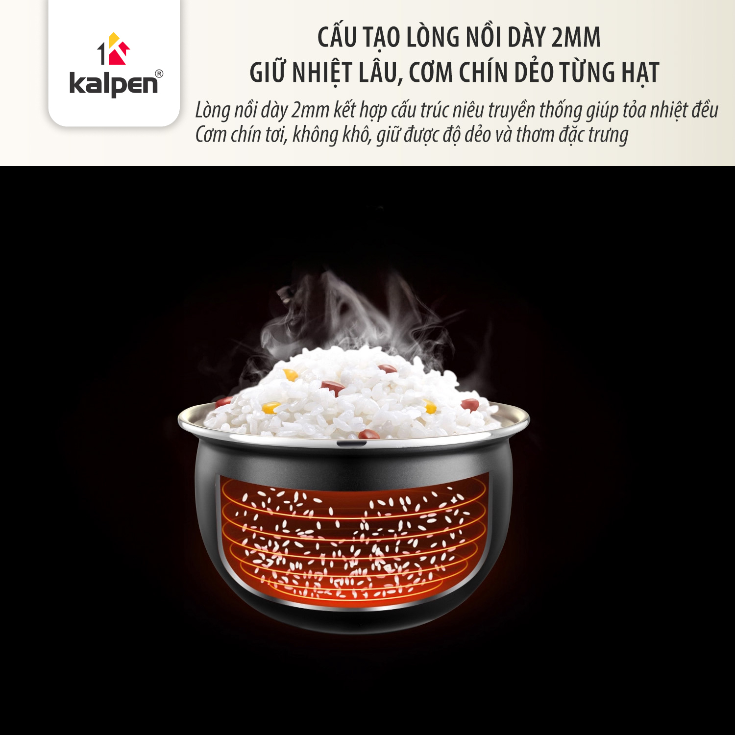 Lòng nồi có độ dày 2 mm, cho khả năng giữ nhiệt lâu, kết hợp cấu tạo dạng lòng niêu giúp cơm chín đều, dẻo thơm và ngon hơn.