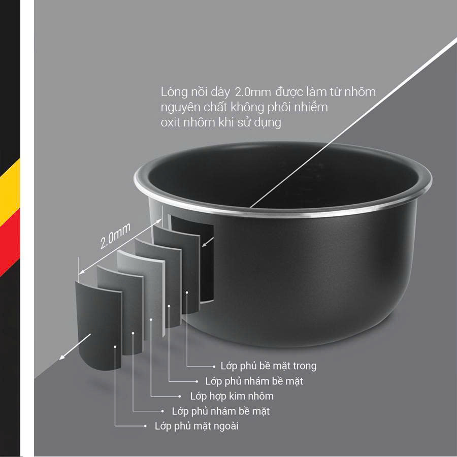 Chất liệu lòng nồi cực tốt: Lòng nồi dày 2mm được làm từ nhôm nguyên chất không phôi nhiễm oxit nhôm khi sử dụng, vừa có tuổi thọ cao mà đảm bảo an toàn.