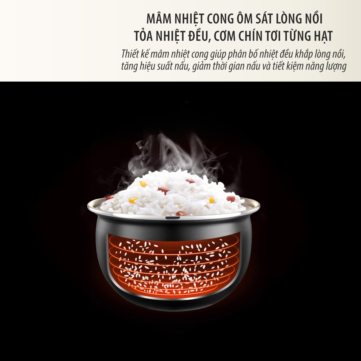 Với dung tích 1.8L, bạn có thể nấu cơm đủ cho cả gia đình một lần duy nhất, tiết kiệm thời gian và công sức. Đồng thời, công nghệ ủ ấm 2D đảm bảo cơm chín đều từ mọi góc độ, giữ nguyên độ ẩm và sốt dẻo hấp dẫn. Lòng nồi dày 2mm phủ chống dính cao cấp giúp ngăn chặn cơm dính và dễ dàng làm sạch nồi sau mỗi lần nấu. Công suất 700W giúp nấu cơm nhanh chóng và tiết kiệm năng lượng.