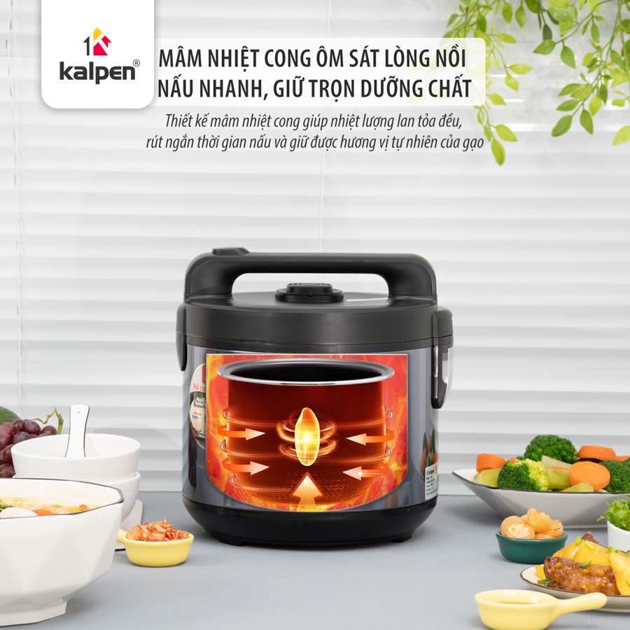 Thiết kế mâm nhiệt cong ôm sát lòng nồi giúp tối ưu hóa khả năng truyền nhiệt và phân bố nhiệt đều trên toàn bộ mặt nồi. Nhờ vậy, thời gian nấu cơm được rút ngắn, tiết kiệm thời gian và năng lượng tiêu thụ.