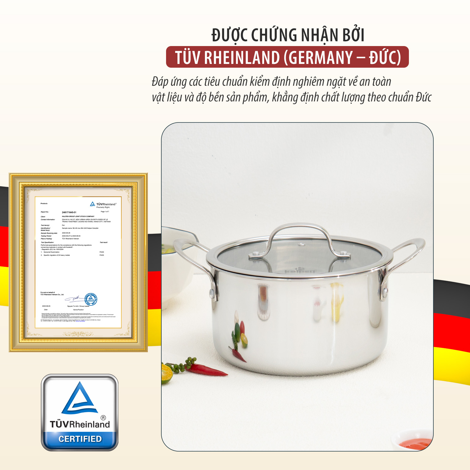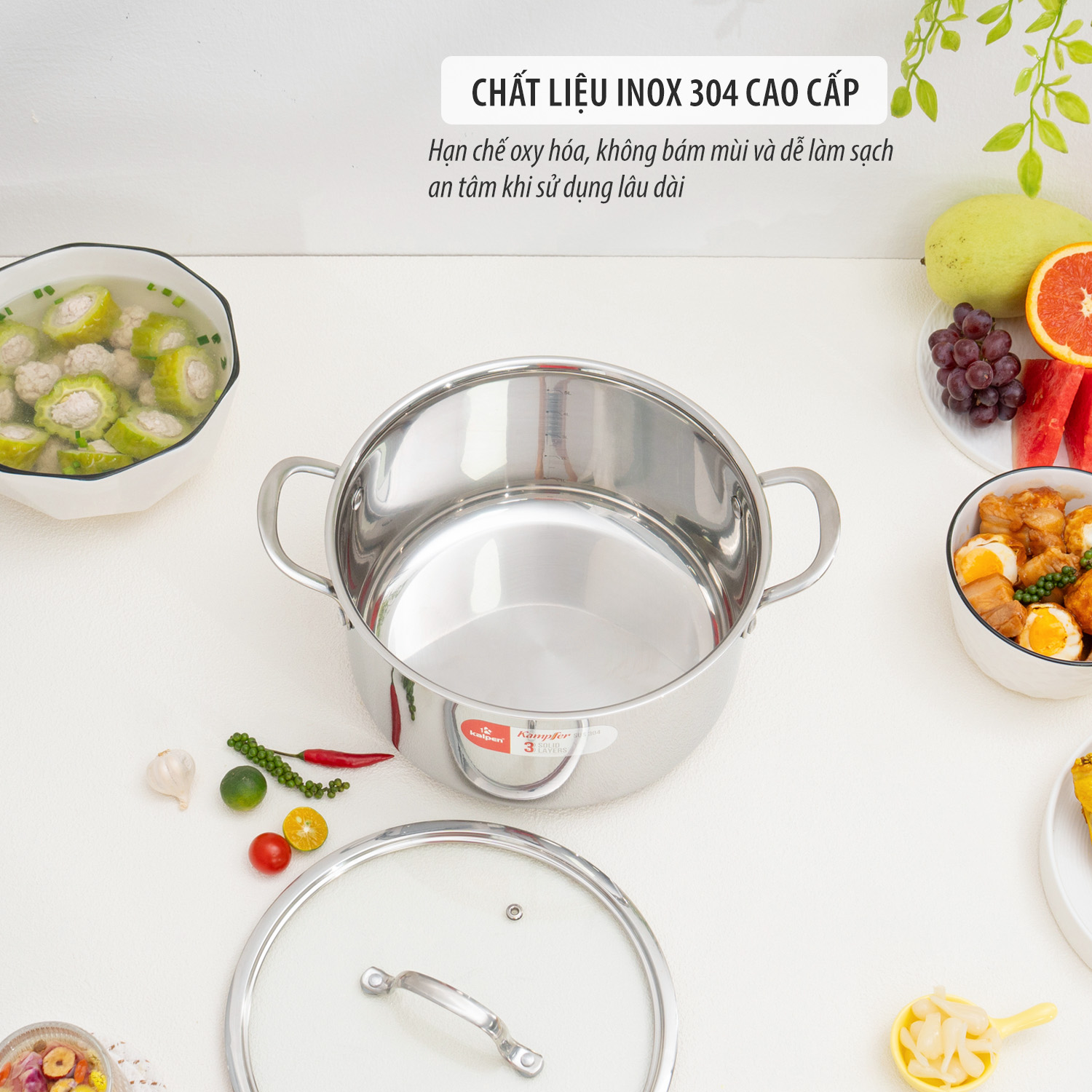 Vung nồi dày 4mm được làm từ kính cường lực trong suốt có thiết kế phẳng chống đọng hơi nước ra mép và có lỗ thông hơi ở nắp vung có tác dụng chống trào hiệu quả.