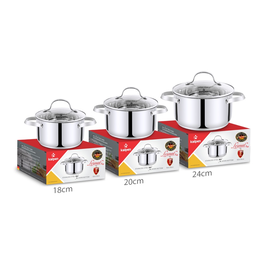 Dòng nồi inox Kalpen Lermat được thiết kế với nhiều kích thước khác nhau, phù hợp với đa dạng nhu cầu sử dụng trong gia đình, người dùng dễ dàng lựa chọn sản phẩm phù hợp với thói quen nấu nướng và số lượng thực phẩm cần chế biến.