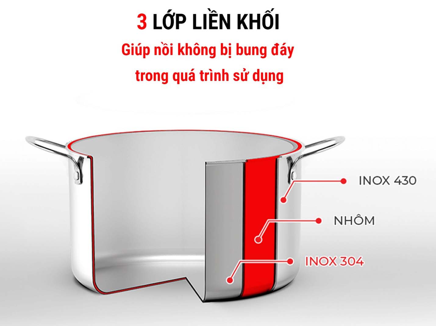 * Nồi inox 3 đáy liền thân: Là nồi có cấu tạo gồm 3 lớp liền thân. Lớp trong cùng tiếp xúc với thực phẩm là inox 304, ở giữa là lớp nhôm truyền nhiệt, ngoài cùng là lớp inox 430 có khả năng bắt từ để nồi sử dụng được trên tất cả các thiết bị bếp.