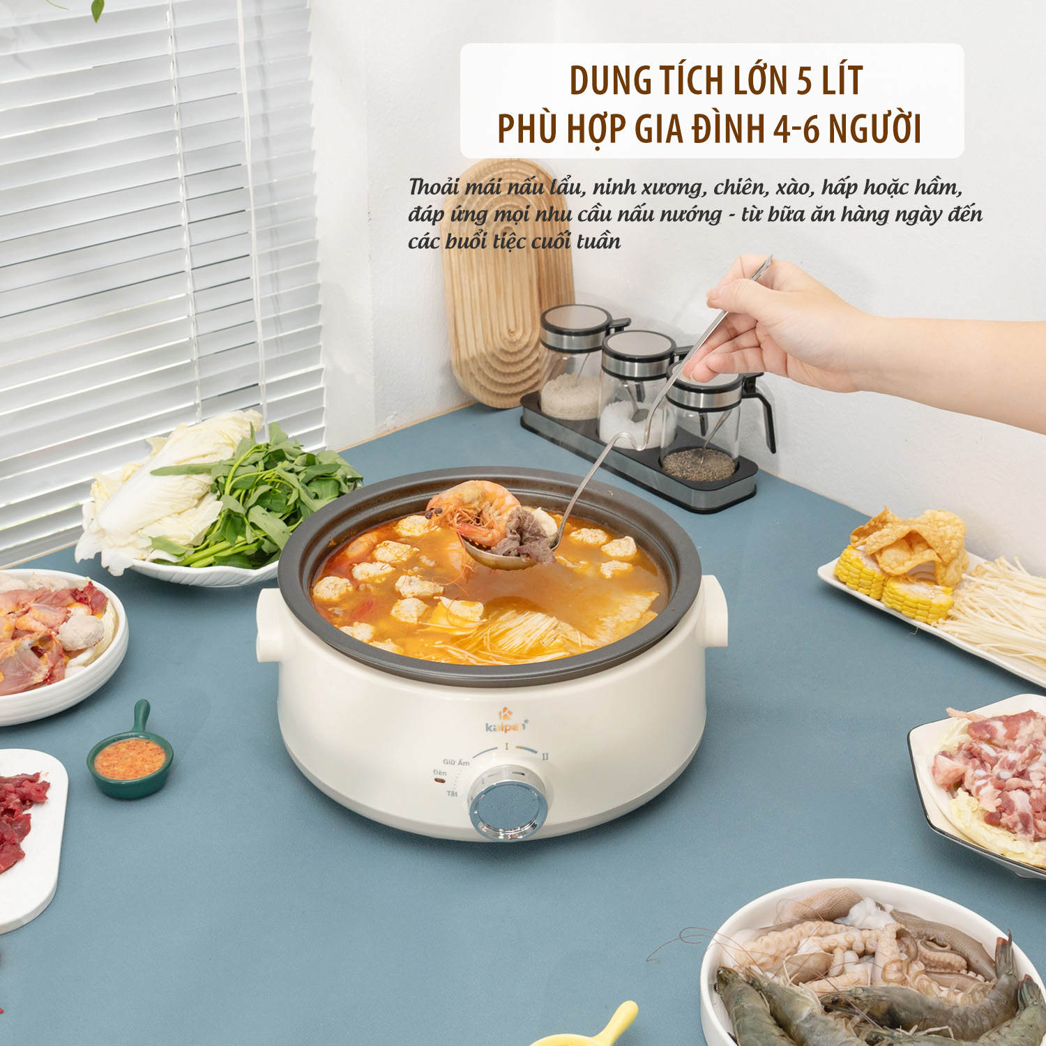 Nồi lẩu điện Kalpen 5L là một chiếc nồi đa năng có thể phục vụ được nhiều nhu cầu nấu nướng từ bữa ăn hàng ngày tới cả những bữa tiệc tùng, tiếp khách.