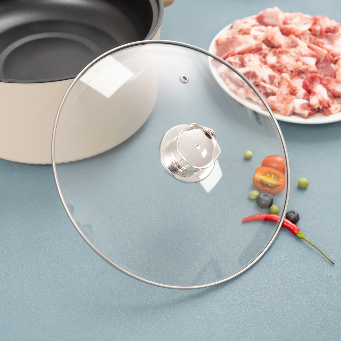 Nắp kính trong suốt giúp quan sát món ăn trong quá trình chế biến. Núm chóp inox tạo điểm nhấn đẹp mắt và chống nóng.