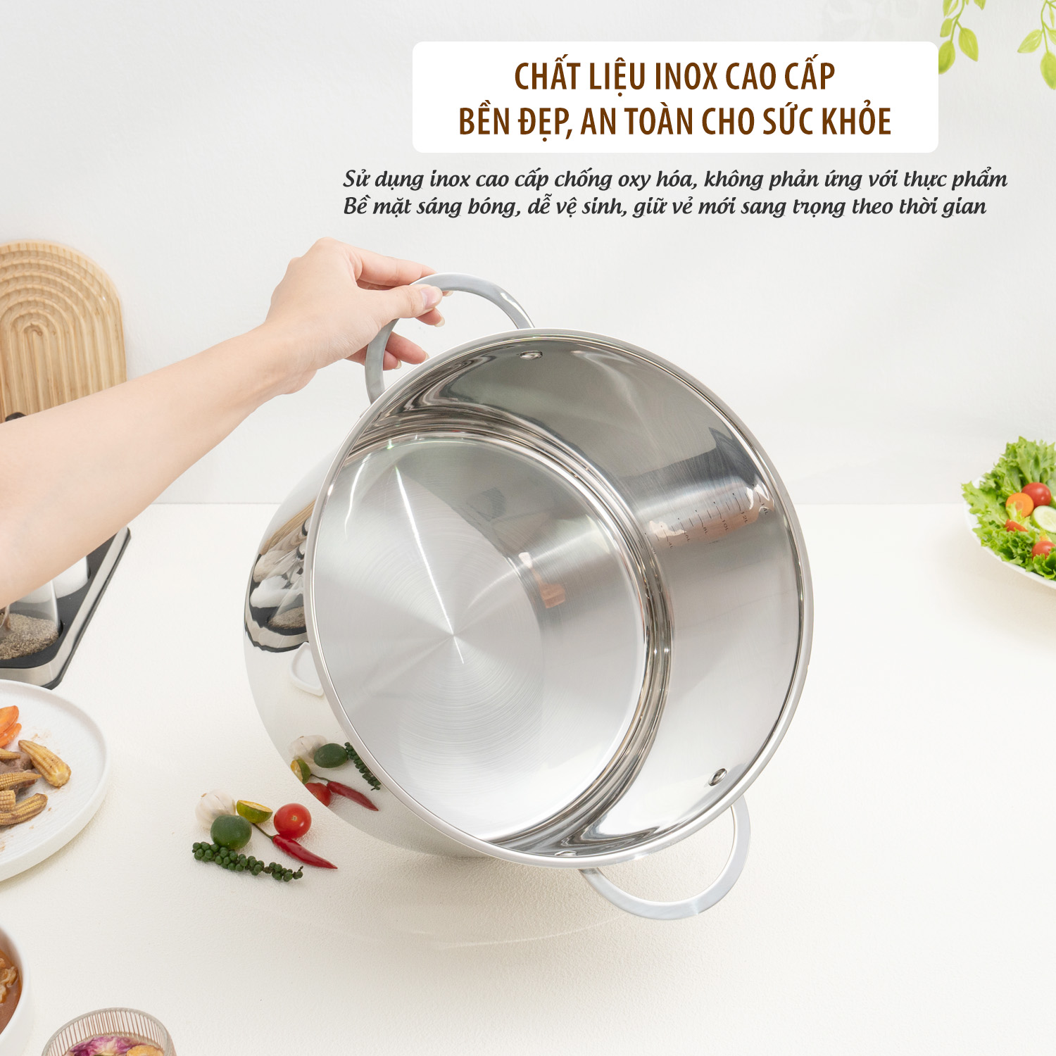 Chất liệu này không phản ứng với thức ăn dù đun nấu ở nhiệt độ cao, đảm bảo giữ trọn dinh dưỡng và hương vị tự nhiên của món ăn.