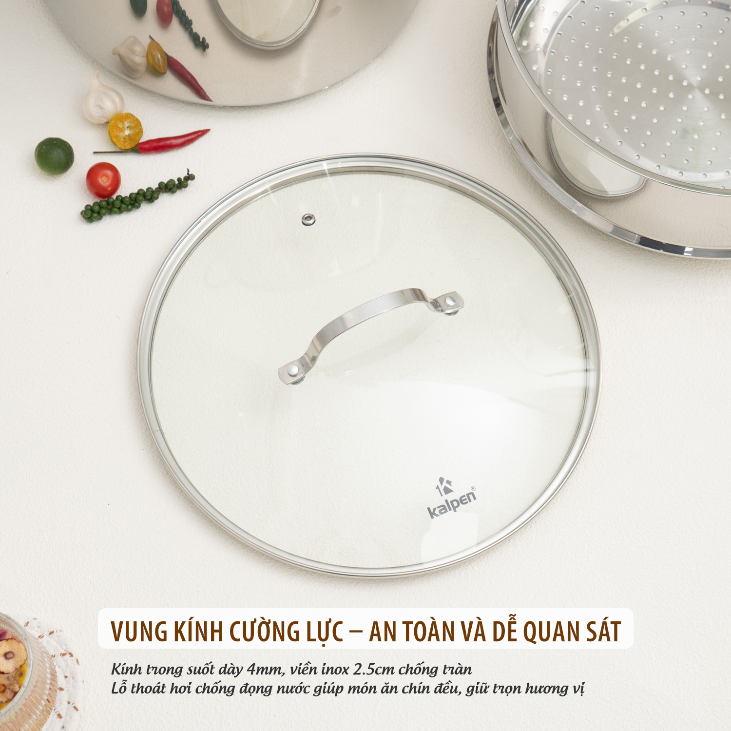 Sản phẩm được trang bị nắp kính cường lực trong suốt, độ dày 4mm, chịu nhiệt và chịu va đập tốt. Thiết kế có lỗ thoát hơi chống đọng nước, giúp bạn dễ dàng quan sát tình trạng chín của món ăn mà không cần mở nắp, tránh thất thoát nhiệt và hơi nước.