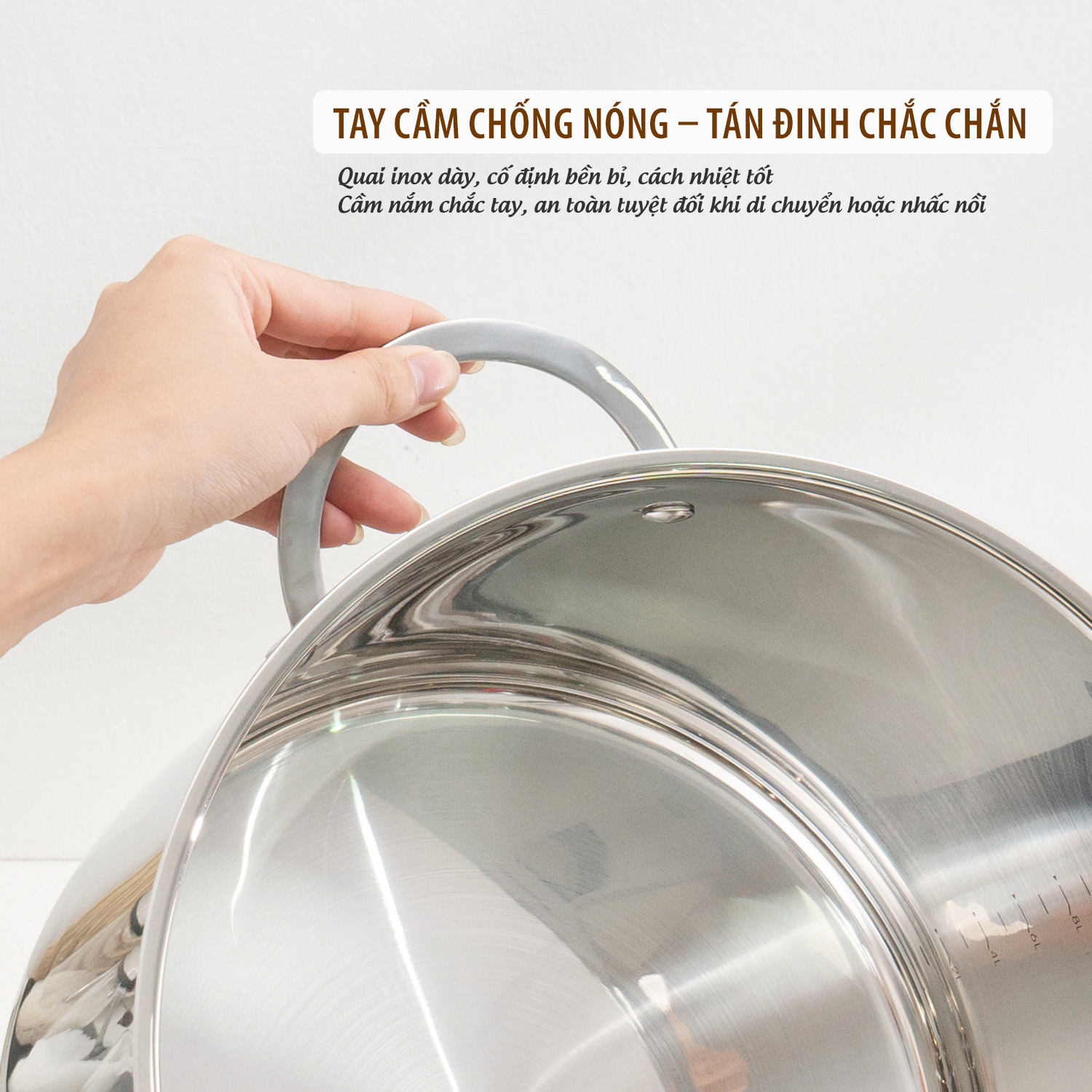 Tay cầm của nồi luộc gà Kalpen Lermat L30Pro được làm từ inox dày, tán đinh chắc chắn. Thiết kế này giúp tay cầm không bị lỏng lẻo, không nóng tay, mang lại sự an toàn tuyệt đối trong suốt quá trình sử dụng ngay cả khi nấu ở nhiệt độ cao.