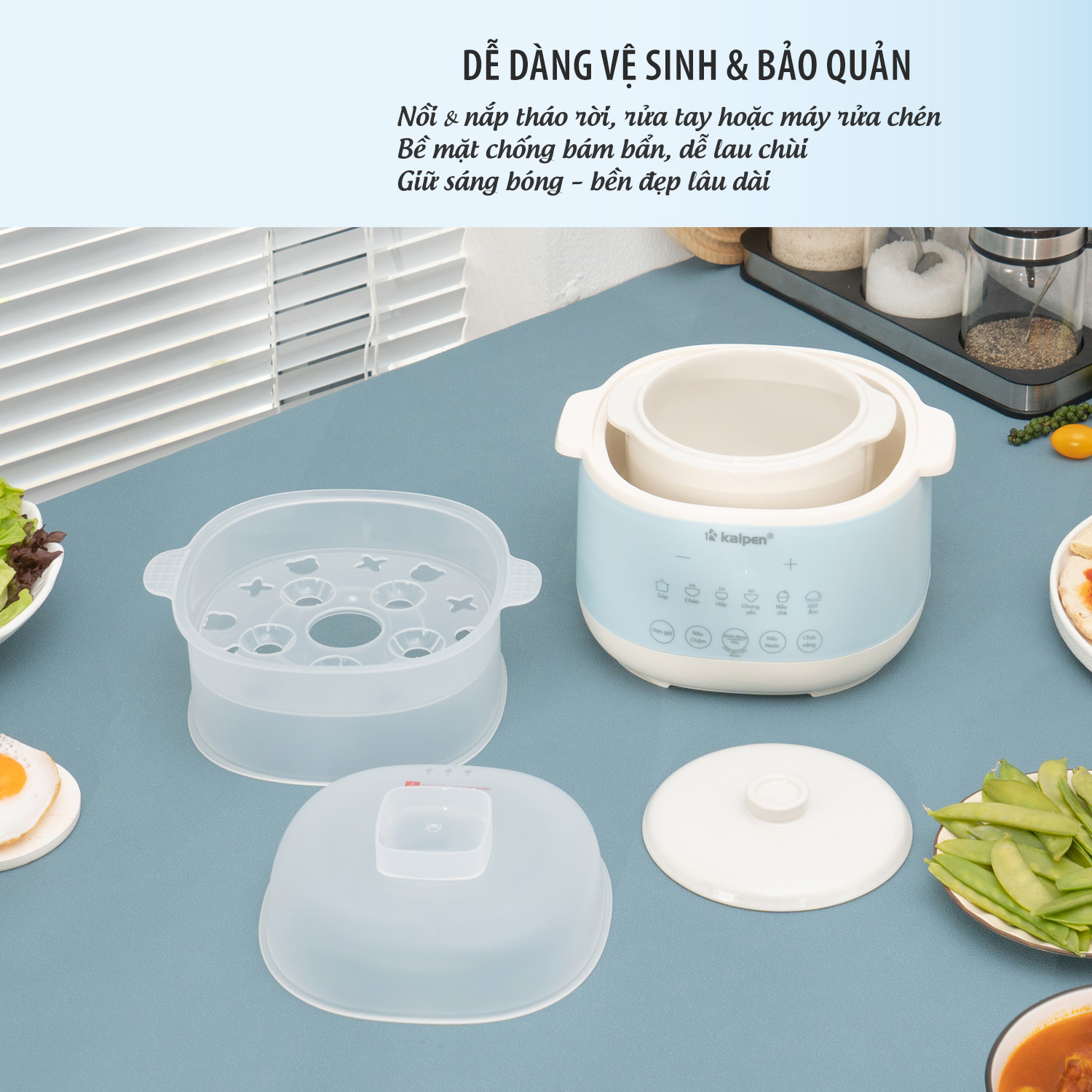 Nồi, nắp nồi, xửng hấp dễ tháo rời thuận tiện cho việc vệ sinh và bảo quản. Có thể rửa bằng tay với nước rửa chén hoặc có thể làm sạch bằng máy rửa bát.
