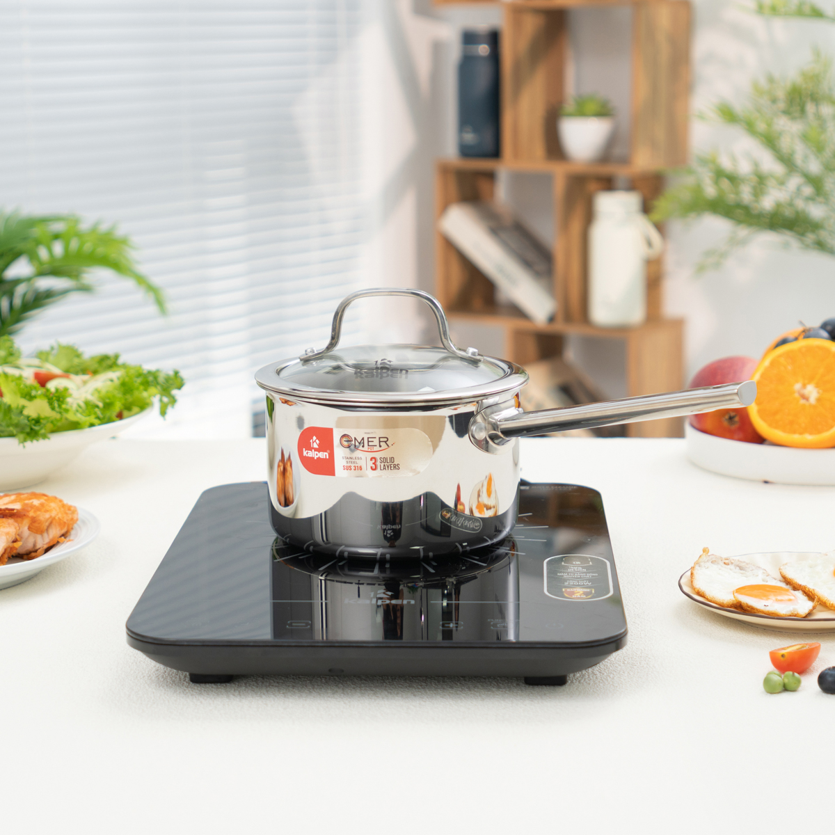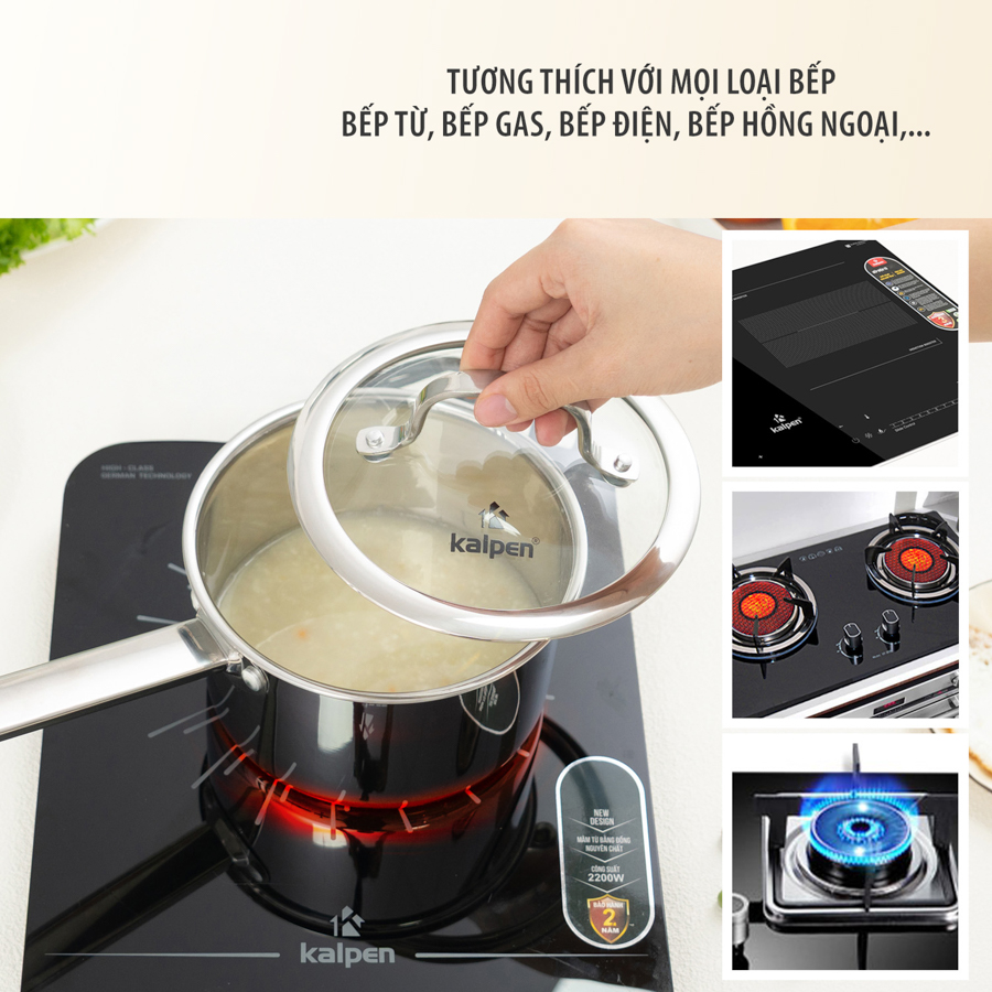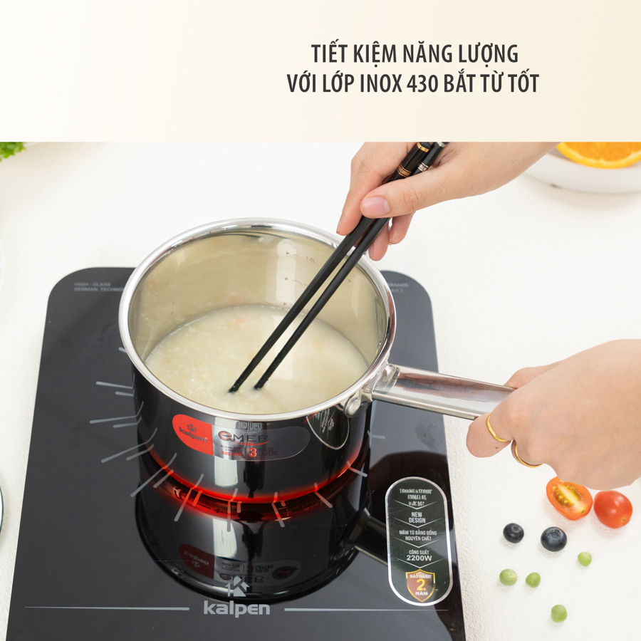 Cấu tạo 3 lớp liền thân giúp quánh inox Kalpen EM16 có khả năng bắt từ siêu nhanh, truyền nhiệt và giữ nhiệt tốt, tiết kiệm điện năng tiêu thụ: Lớp trong cùng tiếp xúc với thức ăn là inox cao cấp, ở giữa là lớp nhôm dày và lớp ngoài cùng là inox 430 tiếp xúc với mặt bếp mang lại hiệu suất nấu nướng tuyệt vời và tiết kiệm nhiên liệu. Thức ăn chín đều, chín nhanh, không bị bám dính.