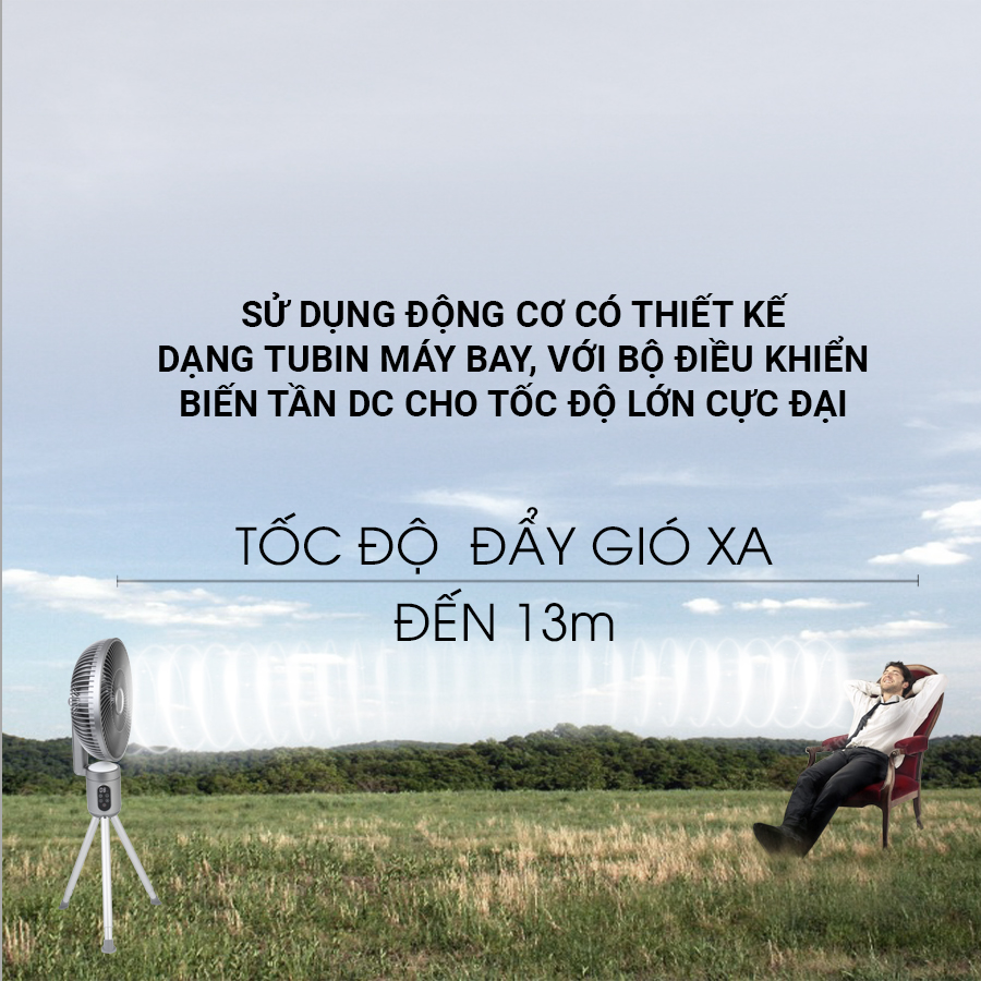 Quạt làm mát thông thường tốc độ đẩy gió của quạt chỉ khoảng 2-3m. Với việc sử dụng động cơ có thiết kế dạng tubin máy bay, với bộ điều khiển biến tần DC cho tốc độ đẩy gió cực đại xa đến 13m với 8 mức cấp độ gió cho người sử dụng dễ dàng tùy chỉnh theo nhu cầu cá nhân.
