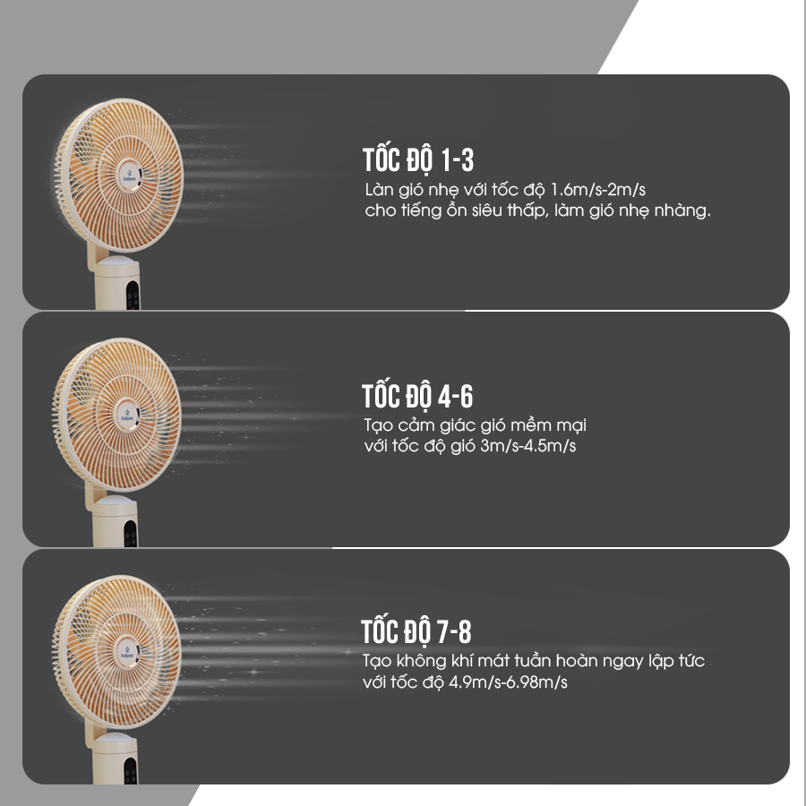 - Tốc độ 1-3: Làn gió nhẹ nhàng, tiếng ồn siêu thấp.
