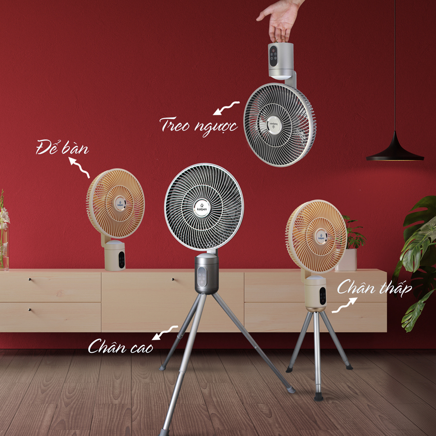 Thiết kế tối ưu cho việc đặt trên bàn, treo lên trần nhà hoặc để đứng như một quạt thông thường.