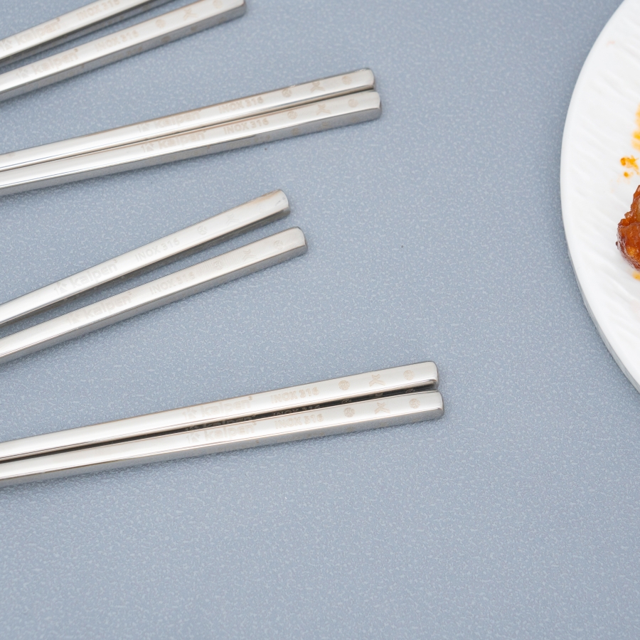 → Không. Nhờ hàm lượng Molybdenum cao trong inox 316, set đũa inox Kalpen giữ được độ sáng bóng và thẩm mỹ bền lâu, không bị xỉn màu ngay cả khi tiếp xúc thường xuyên với thức ăn dầu mỡ hoặc có tính axit.