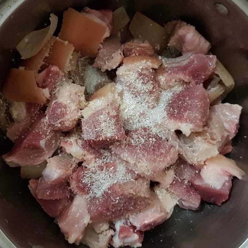 Thái thịt chân giò thành miếng vừa ăn rồi đem ướp với 1 thìa cà phê nước mắm, ½ thì muối bột canh, 1 thìa hạt nêm và ướp trong vòng 30 phút.
