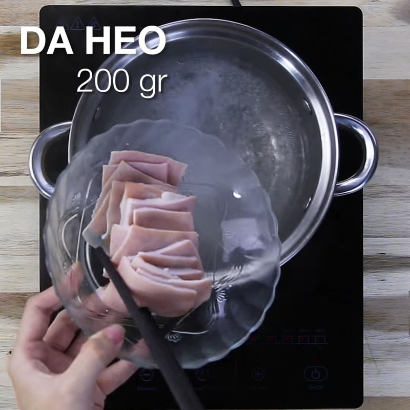 Da heo lọc mỡ thừa còn dính ở da, ngâm với nước muối loãng sau đó rửa sạch với nước, thái miếng nhỏ vừa ăn.