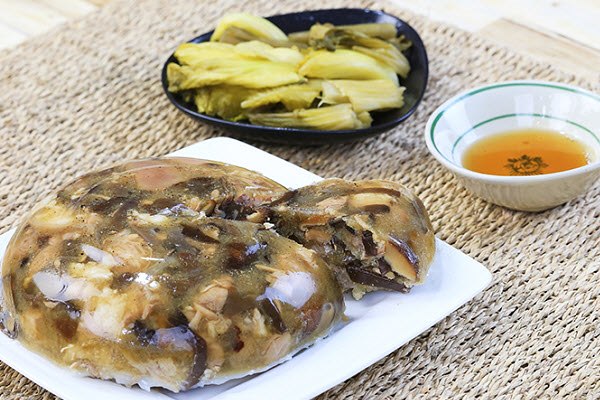 Thịt đông chấm nước mắm, ăn kèm dưa cải chua, củ kiệu muối và ăn cùng cơm nóng sẽ rất ngon.