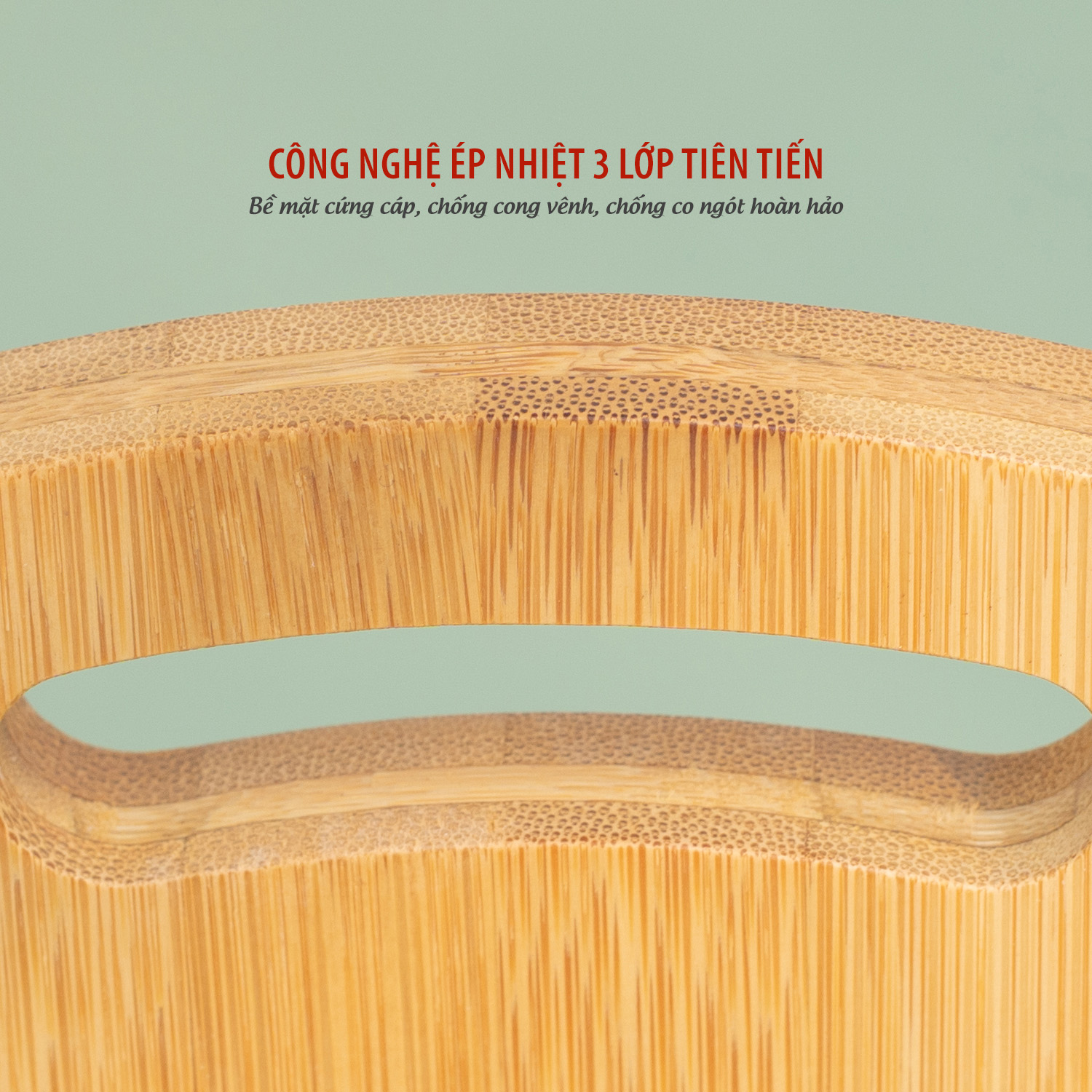 Được áp dụng công nghệ ép nhiệt hiện đại, các nan tre được ép nằm 3 lớp ở nhiệt độ cao dưới áp suất lớn nên thớt tre kháng khuẩn Kalpen T3 dày dặn, chắc chắn, có khả năng chịu lực tốt, hạn chế cong vênh.