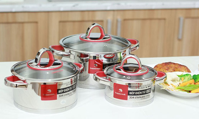 - Bộ nồi Happycook Aries HC06AR được rất nhiều chị em nội trợ yêu thích và lựa chọn không chỉ bởi màu sắc sáng bóng, nổi bật, bắt mắt mà vì đây là một bộ sản phẩm được làm từ inox 304 cao cấp an toàn đối với sức khỏe. Nồi có cấu tạo đáy 3 lớp: trong cùng là inox 304, ở giữa là lớp nhôm và lớp ngoài cùng là inox 430.