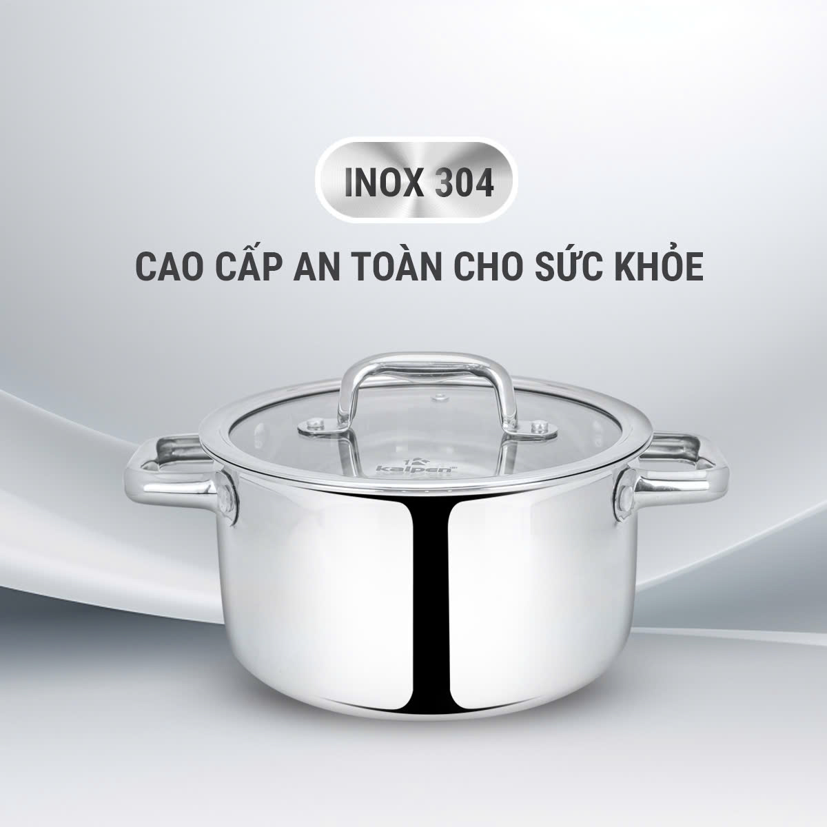 - Nồi inox Kalpen Kampfer được làm từ chất liệu thép không gỉ, đúc liền khối từ thân tới đáy nồi. Lớp trong cùng tiếp xúc trực tiếp với thực phẩm là inox 304 không gỉ sét, không bị oxy hóa, không phản ứng với thực phẩm nên an toàn cho sức khỏe ngay cả khi đun nấu ở nhiệt độ cao hoặc sử dụng lâu dài.
